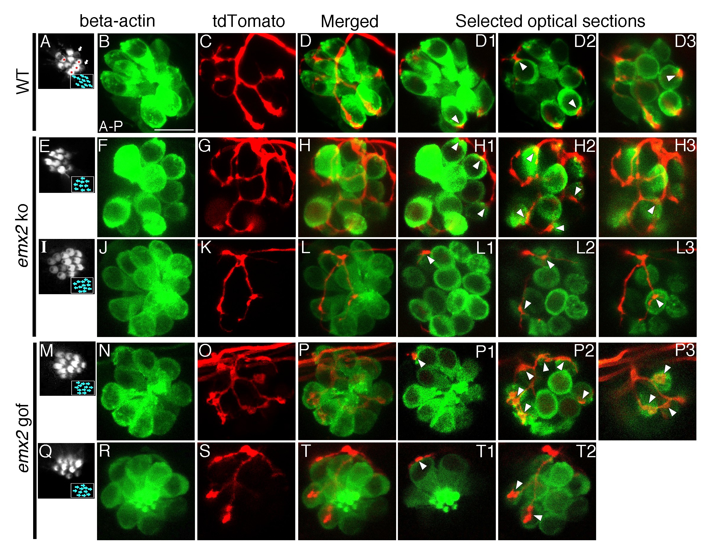 (A–D3) A wildtype neuromast (A) showing five A > P, four P > A (red asterisks), and two immature HCs (white arrows). A single neuroD:tdTomato-labeled afferent neuron (C) contacts four P > A myo6b:actb1-GFP HCs (red asterisks). (D1–D3) Selected optical sections showing nerve fibers (red) contacting cell bodies (green) of HCs (white arrowheads, 4/9 HCs). (E–H3) A single afferent neuron (G) contacting eight out of ten total P > A HCs (H–H3) in an emx2 ko neuromast (arrowheads). (H1–H3) Selected optical sections of (H). (I–L3) A single labeled afferent neuron (K) contacts four out of thirteen total HCs in an emx2 ko neuromast (arrowheads). (L1–L3) Selected optical sections of (L). (M–T) A single afferent neuron (O) contacts ten out of twelve A > P Gfp-positive HCs (M,N) in an emx2 gof neuromast (arrowheads). (P1–P3) Selected optical sections of (P). (Q–T2) A single afferent neuron (S) contacts three out of eleven total A > P HCs (Q, R,T) in an emx2 gof neuromast (arrowheads). (T1–T2) Selected optical sections of (T). The number of neuromasts: WT, n = 11; emx2 ko major, n = 8, minor, n = 4; emx2 gof major n = 12, minor n = 6. Scale bar = 10 μm.