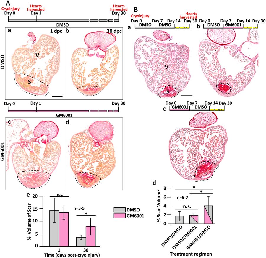 GM6001 inhibits heart regeneration after cryoinjury. (A) Representative picrosirius red stained paraffin sections of wild type fish hearts at (Aa, Ac) 1 dpc and (Ab, Ad) 30 dpc, after the fish were injected with either DMSO (controls) or GM6001 (prepared in DMSO). ‘V’ and ‘S’ are the ventricle and scar (of the injured area), respectively. Scale bar: 200 µm. (Ae) Bar graph to show the percentage of the scar volume in the DMSO- and GM6001-injected fish at 1 dpc and 30 dpc. The data are expressed as mean ± standard deviation of n = 3 to 5 hearts. The asterisk indicates GM6001 data that are significantly different from the DMSO controls at p < 0.05, two-tailed t-test. (B) Representative picrosirius red stained paraffin sections of wild type hearts harvested at 30 dpc, after the fish were injected with: (Ba) DMSO every day for the first 14 dpc; (Bb) DMSO for the first 7 dpc and GM6001 for the next 7 dpc; or (Bc) GM6001 for the first 7 dpc and DMSO for the next 7 dpc. ‘V’ and ‘S’ are the ventricle and scar (of the injured region), respectively. Scale bar: 200 µm. (Bd) Bar graph to show the percentage of scar volume in the ventricle following the different DMSO and GM6001 injection regimens. The data are expressed as mean ± standard deviation of n = 5 to 7 hearts. The asterisks indicate significantly different data at p < 0.05, and ‘n.s.’ indicates results where no statistically significant differences were found, one-way ANOVA with LSD Post-hoc test.