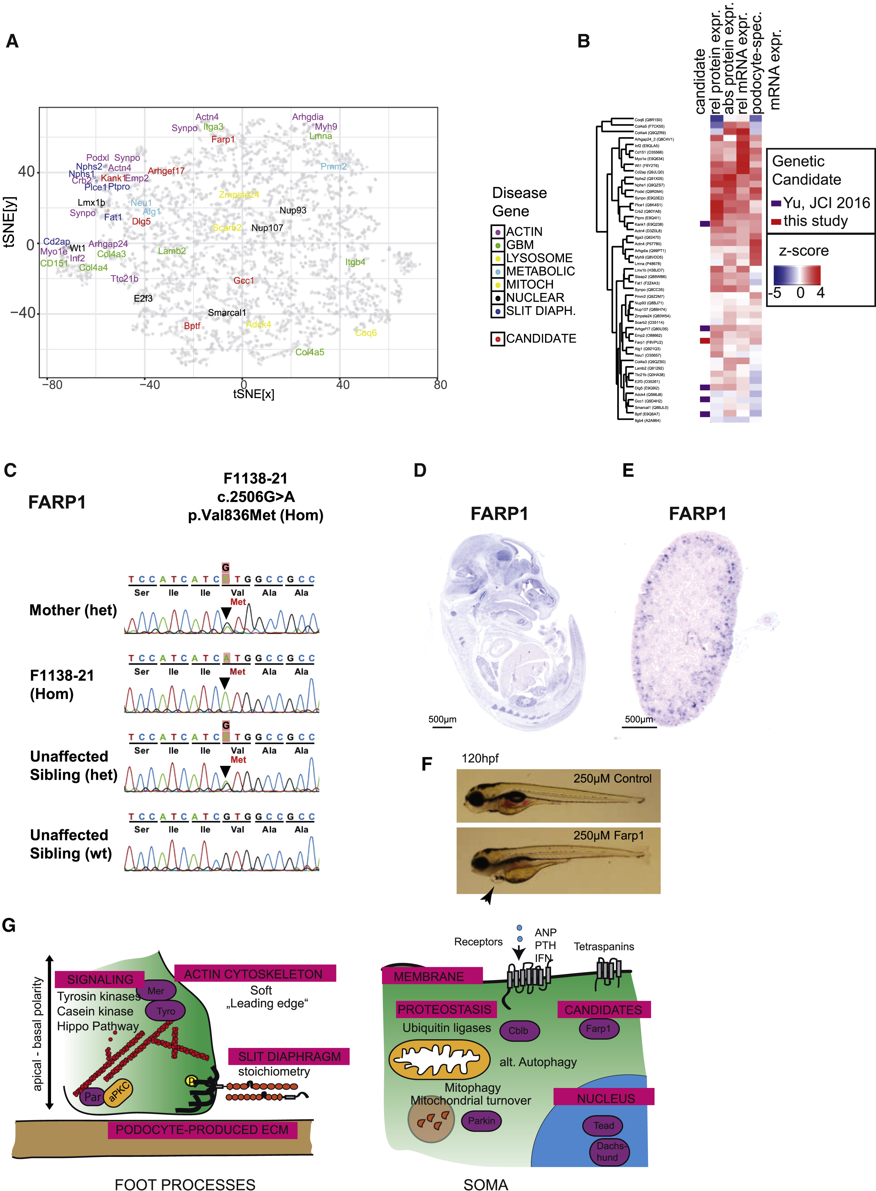 (D and E) Embryonic and renal expression profile of the candidate protein Farp1 by in situ hybridization.