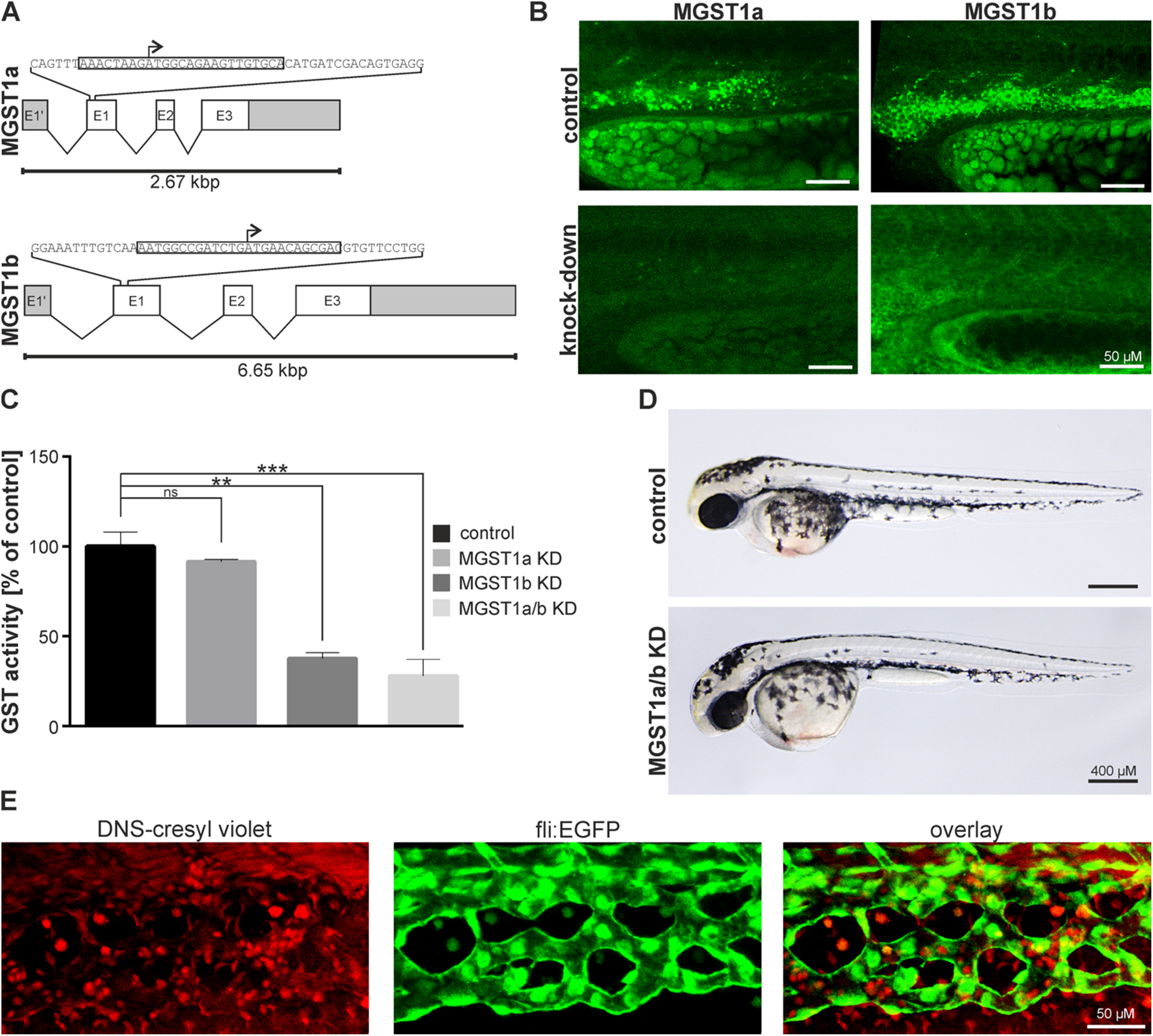 Morpholino induced knock-down of MGST1 in zebrafish. (A) Genomic organization of zfMGST1 and location of morpholino attachment sites targeting transcription. (B) Immunohistochemistry in embryos injected with morpholinos knocking down MGST1a/b. (C) Enzymatic activity of GST enzymes in extracts of embryos injected with morpholinos knocking-down MGST1a, MGST1b or both. (D) Gross morphology of embryos injected with morpholinos knocking-down MGST1a/b. (E) DNS-cresyl violet staining indicating MGST1 positive cells in the caudal hematopoietic tissue, see also Supplementary movie S1. Brightfield images were taken on a Leica MZ16 microscope equipped with a Leica DFC300FX camera; Confocal images were taken on a Leica LSM700 with a 20× lens; Alexa 488 and 555 filters were used; images stacks were produced with ImageJ, GIMP was used to adjust the gamma channel.