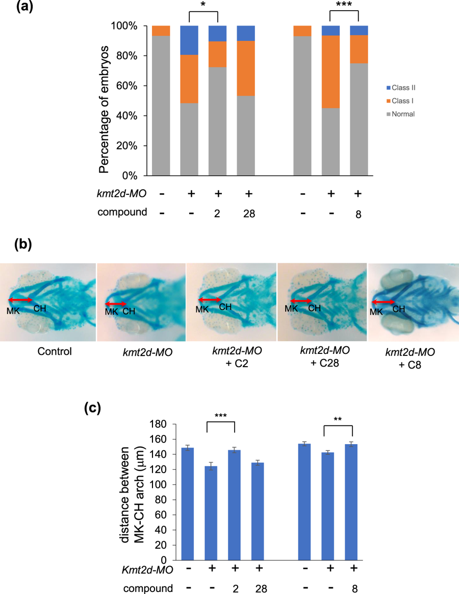 Compounds 2 and 8 ameliorate CE and jaw defects caused by loss of kmt2d. (a) Compounds 2 and 8, but not 28 (negative control), rescue CE defects of kmt2d morphants. (b) Alcian blue staining of jaw. Depletion of kmt2d leads to a change in jaw layout, reducing the distance between Meckel’s (MK) cartilage and ceratohyal (CH) cartilage (red double arrow). Treatment with compound 2 or 8, but not 28, ameliorates this defect in kmt2d morphants. (c) Quantitative measurement of the distance between MK and CH cartilages (n > 25). *p < 0.05; **p < 0.01; ***p < 0.001. Error bars show SEM (standard error of the mean).