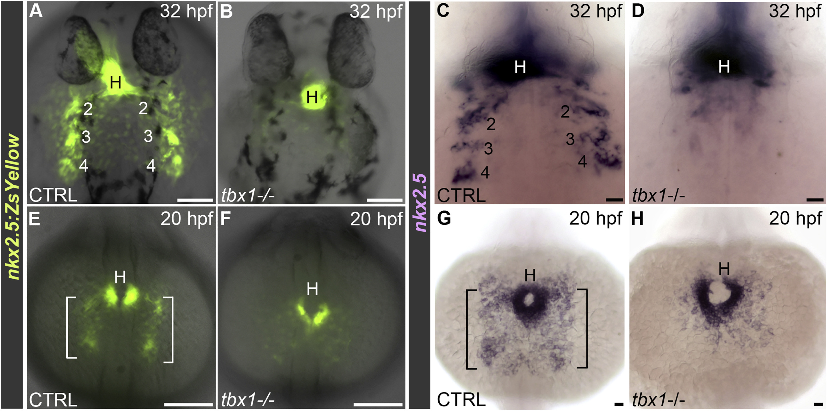 (E and F) Merged bright-field and fluorescent images of 20 hpf CTRL (E; n = 30) and tbx1 mutant (F; n = 8) embryos carrying the Tg(nkx2.5:ZsYellow) transgene. The brackets in (E) highlight the ZsYellow+ the pharyngeal progenitor population missing in (F). Dorsal views, anterior up.
