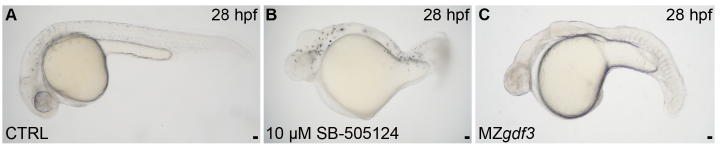 (A,B) Brightfield images of 28 hours post-fertilization (hpf) wild-type animals treated with DMSO (CTRL, A, n=25) or 10mM SB-505124 (B, n=25) and a 28 hpf MZgdf3 embryo (C, n=40). Lateral views, anterior left. Little to no variation was observed between animals in each experimental group. Scale bars=25μm.