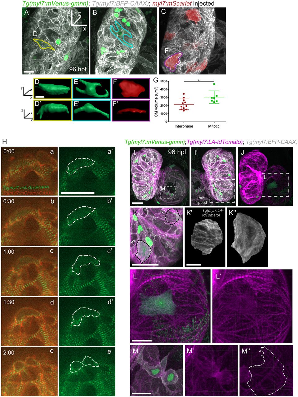 Sarcomere disassembly, as well as cell shape and volume changes, are observed before cardiomyocyte division. (A-C) Three-dimensional reconstruction of 96 hpf Tg(myl7:mVenus-gmnn); Tg(myl7:BFP-CAAX) larvae injected with myl7:mScarlet plasmid to label individual cardiomyocytes; (D-F′) the cardiomyocytes used for 3D surface rendering are outlined in A-C. (D-F′) Three-dimensional surface rendering of individual mitotic (D-E′) and interphase (F,F′) cardiomyocytes. The thickness of the mitotic cardiomyocytes is increased and their shape appears more rounded. (G) Measurement of the cell volume of mitotic and interphase cardiomyocytes located in the outer curvature of the heart, as measured through the mVenus-Gmnn or mScarlet signal; each point represents a cardiomyocyte from seven different larvae. Data are mean±s.d., *P=0.0266; Student's two-tailed t-test. (H) Time-lapse imaging of beating Tg(myl7:actn3b-EGFP); Tg(myl7:mCherry-CAAX) hearts starting at 80 hpf. Dashed line outlines the dividing cardiomyocyte. The organized sarcomeric pattern (a,a′) becomes gradually lost (b-c′) and the Actn3b-EGFP signal is detected close to the borders of the cardiomyocyte (d,d′) prior to its division (e,e′). Five larvae imaged; four cardiomyocytes were seen completing their division. (I-J) Three-dimensional reconstruction of 96 hpf Tg(myl7:mVenus-gmnn); Tg(myl7:LA-tdTomato); Tg(myl7:BFP-CAAX) hearts (12 larvae imaged). I′ is a mirror image of I. (K) Higher magnification of the ventricular region outlined in I′. An individual interphase cardiomyocyte exhibits an organized striated pattern of sarcomeres (K′), whereas in a dividing cardiomyocyte, the organized pattern is lost and the fluorescent signal appears more diffuse (K″). (L,L′) Higher magnification of the atrial area outlined in J, where sarcomere disassembly is clearly visible in a dividing cardiomyocyte (L′). (M-M″) Details of a dividing cardiomyocyte in the atrium that appears to be undergoing cytokinesis. Organized sarcomeric structures are absent, in contrast to neighboring cardiomyocytes (M″). Scale bars: 20 µm in A,H,I,K,L,M; 5 µm in D,K′. Bars in I,K′,L and M apply to I-J,K″,L′ and M′,M″.
