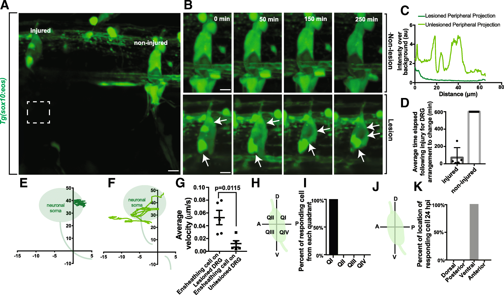 Ensheathing cells respond to peripheral neuronal injury. (a). Confocal z-projection image of a Tg(sox10:eos) zebrafish with a DRG with a peripheral lesion and an adjacent non-lesion DRG. White box denotes site of lesion. (b). Confocal z-projection image of a 24-h timelapse starting at 72 hpf in a Tg(sox10:eos) zebrafish. Top images denote a non-lesion DRG, and bottom images denote a DRG with a peripheral lesion. White arrows denote the movement of ensheathing cells. (c). Intensity profile of lesioned and non-lesioned peripheral axons. (d). Time elapsed after lesion for rearrangement of ensheathing cells in lesioned and non-lesioned DRG (n = 5 lesion DRG, n = 5 non-lesion DRG). (e-f). Plots of ensheathing cells following axonal lesion on non-lesioned (e) and lesioned (f) neurons. Shaded gray areas denote location of the neuron. (0,0) denotes the center of the peripheral axon. (g). Average velocity of ensheathing cells following injury on lesioned and non-lesioned neurons (n = 5 lesion DRG, n = 5 non-lesion DRG). (h). Schematic compass of DRG neuron into quadrants. D denotes dorsal, P denotes posterior, V denotes ventral, A denotes anterior. (i). Percentage of responding cells that originate in each quadrant of the neuron (n = 5 DRG). (j). Schematic compass of DRG neuron by anatomical descriptor. D denotes dorsal, P denotes posterior, V denotes ventral, A denotes anterior. (k). Percentage of responding cells that stabilize in each portion of the neuron (n = 5 DRG). (g) uses an unpaired Student’s t-test. Scale bar is 10 μm (a, b)