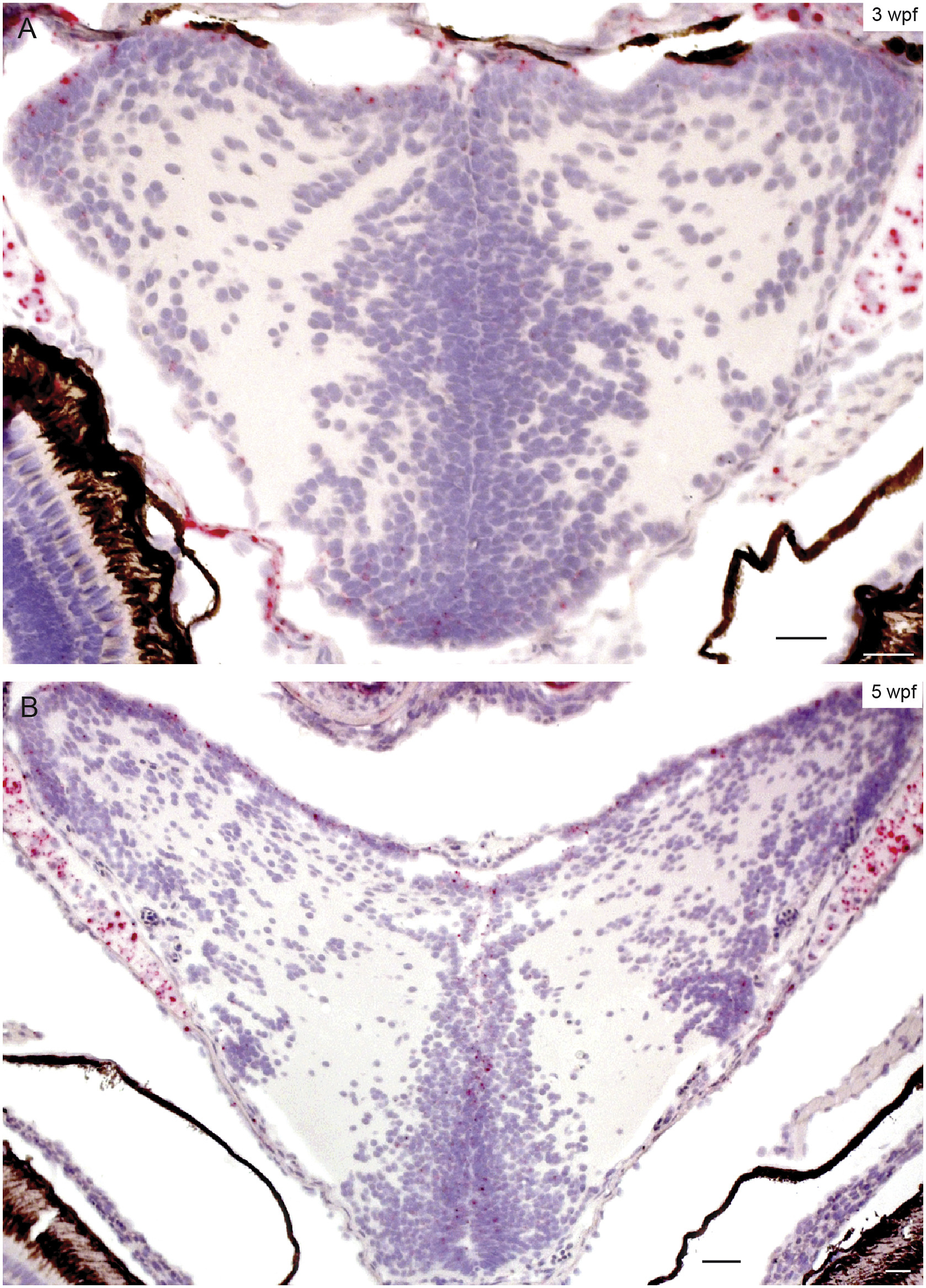 Expression pattern of fgfr3 in the juvenile zebrafish brain. Coronal sections at A) 3 wpf (SL 8 mm), B) 5 wpf (SL 12 mm) specimens, 20x magnification. Scale bar = 20 μm.