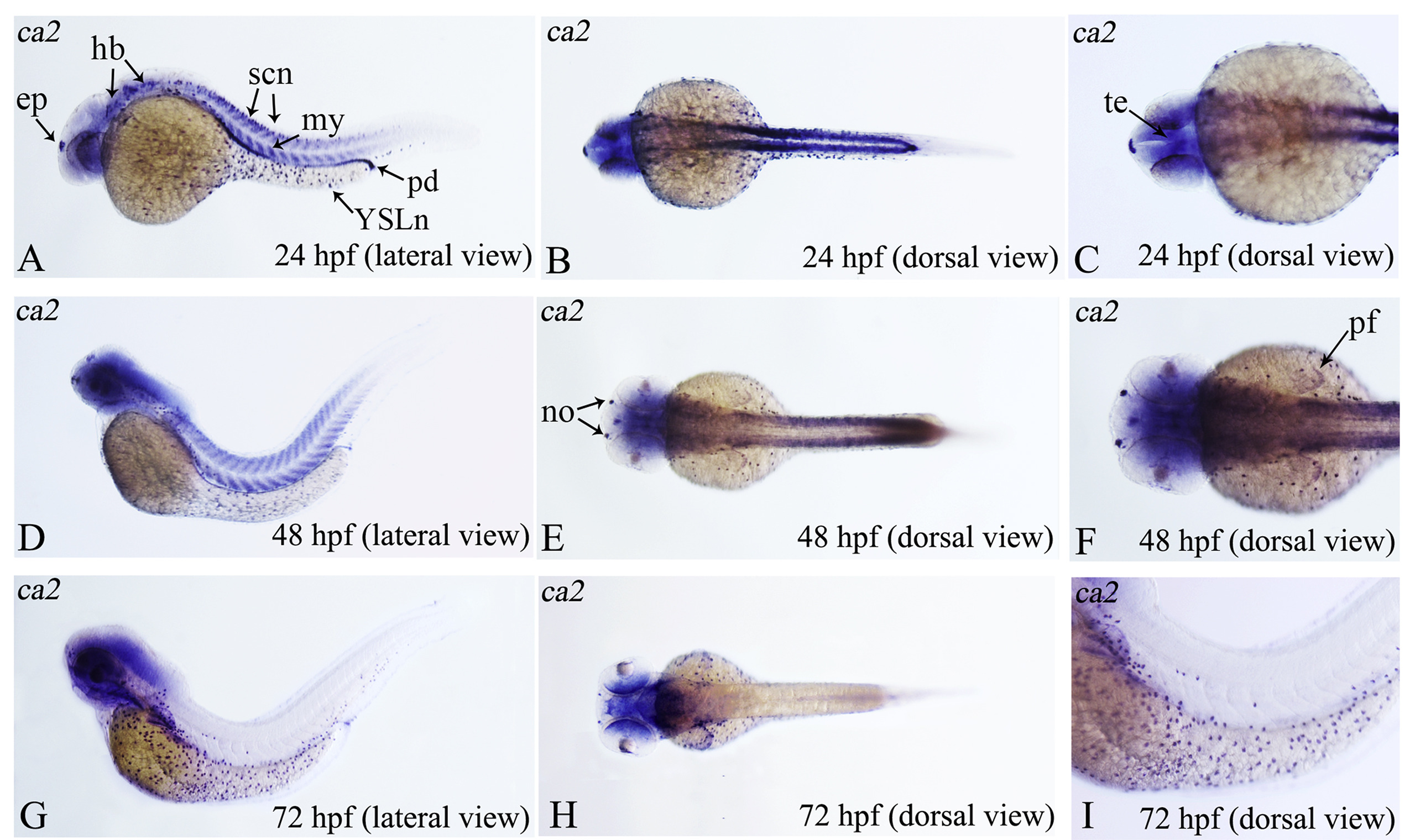 The expression pattern of ca2 detected by WISH. Stages of embryonic development: A-C. 24 hpf; D-F. 48 hpf; G-I. 72 hpf (hpf, hours post-fertilization); C, F, I. High magnification views of B, E and G respectively. ep: epiphysis; hb: hindbrain; my: myotomes; no: nose; pd: pronephric ducts; pf: pectoral fin; scn: spinal cord neurons; te: tegmentum; YSLn: YSL nuclei.