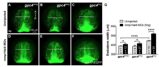 Mmp14a/b and Gpc4 act synergistically in regulating endodermal migration.