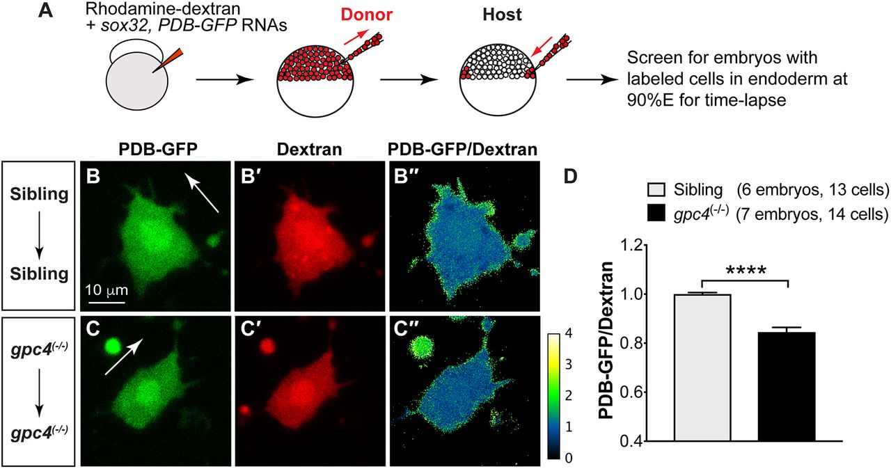 Glypican 4 regulates Rac1 activity in migratory endodermal cells. (A) Schematic diagram illustrating the endoderm transplantation procedure. Donor embryos obtained from crossing gpc4 heterozygous fish were injected with sox32 and PDB-GFP RNAs plus rhodamine-dextran (a marker of cell volume) at the one-cell stage. At the blastula stage, 30-50 donor cells were transplanted into host embryos obtained from crossing gpc4 heterozygous fish. (B-C″) Confocal time-lapse analysis of endodermal cells expressing (B,C) PDB-GFP, a fluorescent Rac1 probe, and (B′,C′) dextran. Rac activity was determined as the ratio of the PDB-GFP:dextran signals, and is displayed as radiometric pseudocolored images (B″,C″). Yellow indicates a higher value of PBD relative to dextran. White arrows indicate the direction of migration of endodermal cells (Movie 3). (D) The mean ratio of PDB-GFP:dextran in indicated embryos. The numbers of embryos and cells analyzed are shown. ****P<0.0001; Student's t-test.