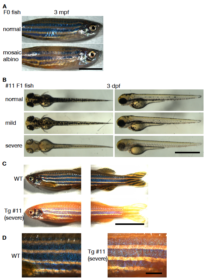 Generation of transgenic albino (Tg-albino) zebrafish. (A) Representative images of the lateral views of 3-mpf F0 fish. (lower) Some fish show mosaic albino phenotype. (B) Representative images of the dorsal views (left) and lateral views (right) of 3-dpf F1 larvae derived from F0#11 (founder) fish. F1 larvae with normal pigmentation (top), mild albino phenotype (middle), and severe albino phenotype (bottom). (C) Representative images of the lateral views of adult wild-type (WT; upper) and transgenic (Tg; lower) fish. (D) Magnified images of the trunk region of the fish shown in D. Scale bars: 5 mm (A), 1 mm (B), 1 cm (C), 2 mm (D).