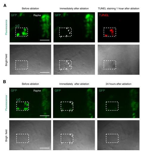 Confirmation of LC neuron death induced by two-photon laser-based ablation, Related to Figure 2.