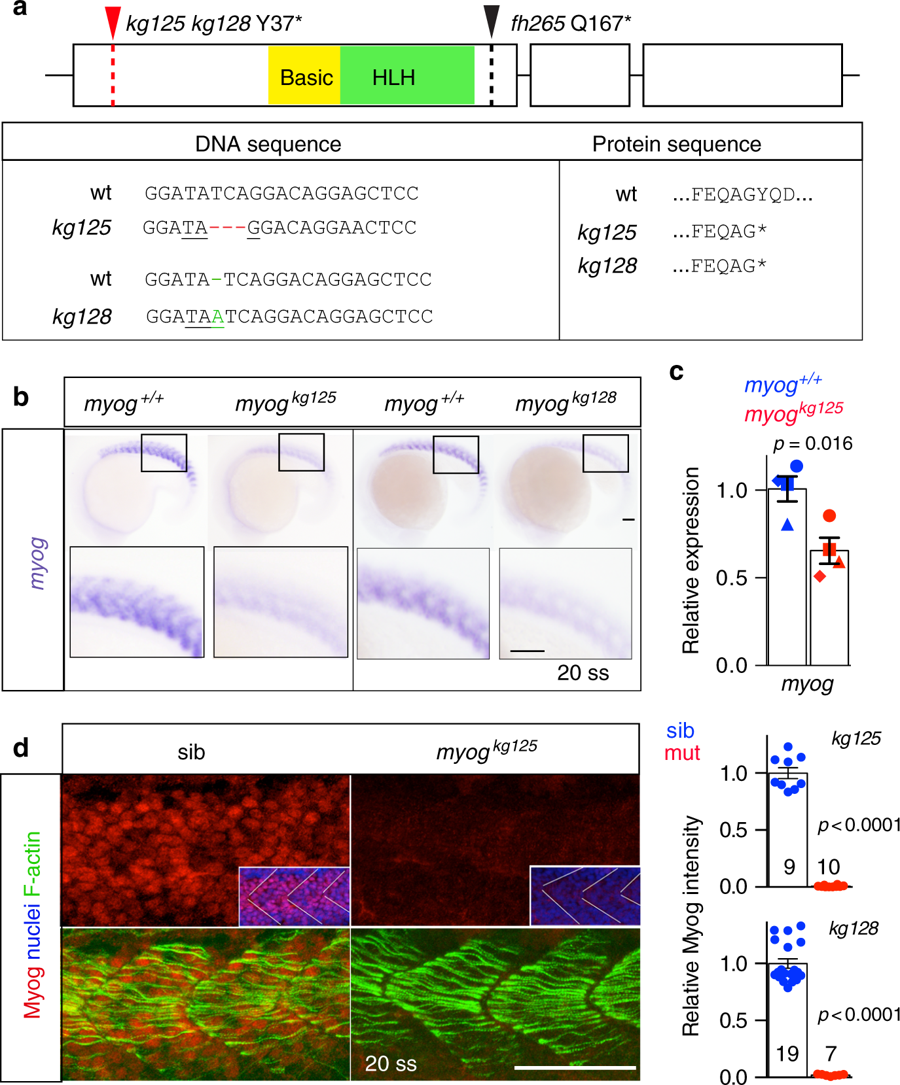 Genome editing generates zebrafish myog null alleles. a Schematic of myog gene exons (boxes) and protein showing the position of kg125, kg128 and fh265 mutant alleles. The tyrosine to stop mutations (Y37*) produce a truncated protein of 36 amino acids (aa) devoid of both basic (yellow) and helix–loop–helix (HLH, green) domains. The fh265 hypomorphic allele (Q167*) truncates downstream of bHLH. Beneath, DNA and protein alignment of wild-type (wt), 3 bp kg125 deletion (red) and 1 bp kg128 insertion (green) alleles with novel stop codons underlined causing an identical truncation. b In situ mRNA hybridisation (ISH) for myogenin on myogkg128/+ and myogkg125/+ incross lays reveal NMD of mutant myog mRNA at 20 somite stage (20 ss). Representative images n = 14 + 5 mutants, n = 39 + 22 sibs, respectively. Insets show magnification of boxed areas. c qPCR analysis on wt sibs and myogkg125 embryos at 22 ss confirms NMD. Mean fold change ± SEM from four independent experiments on genotyped embryos from four separate lays analysed on separate days, paired t test statistic. Symbol shapes denote matched wt and mutant samples from each experiment. d Immunoreactivity of Myog is lost in myogkg125 and myogkg128 mutants at 20 ss, whereas F-actin is unaffected. Insets show nuclear staining in myogkg125 and sib using Hoechst counterstain. Relative myotomal Myog immunofluorescence was assessed by nuclear intensity measurement. All images are lateral views anterior to left, dorsal to top. Representative images n = 10 + 7 mutants, n = 9 + 19 sibs, respectively. Bars = 50 µm