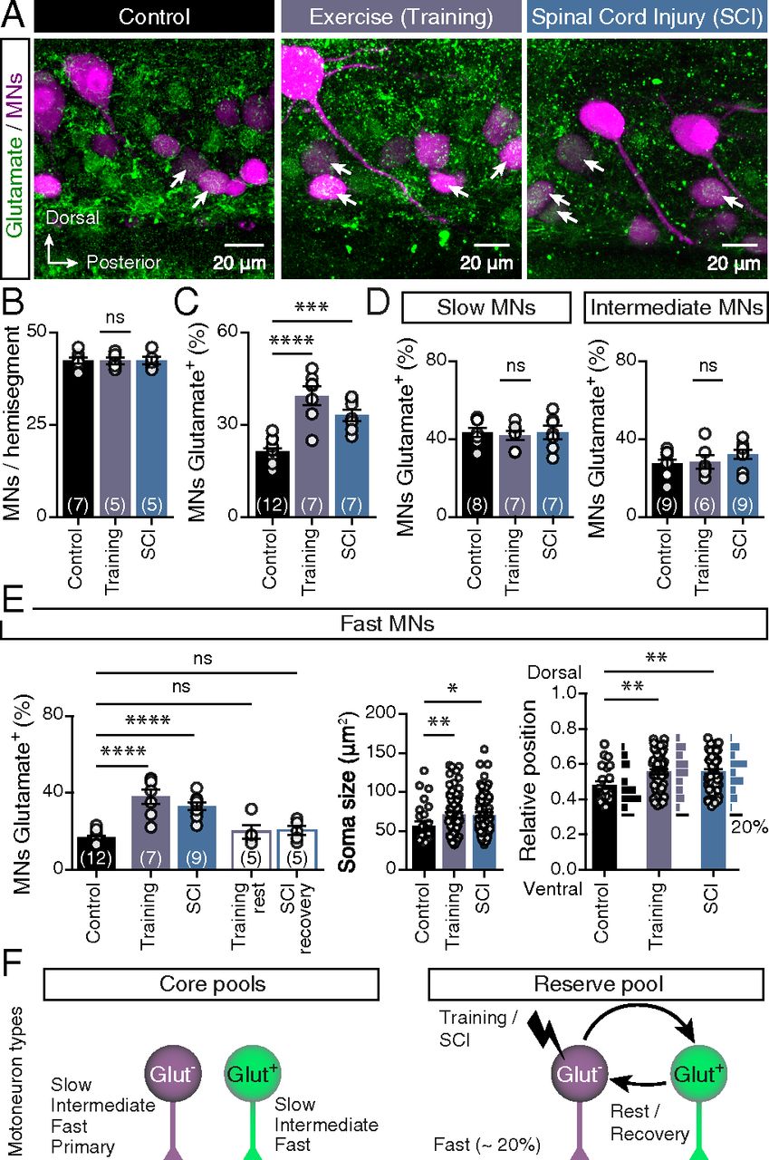 Respecification of motoneuron glutamatergic phenotype. (A) Representative whole-mount confocal images showing glutamatergic expression in axial motoneurons (MNs) of control animals, after swim training and after SCI. (B) Quantification of numbers of axial motoneurons. (C) Changes in percentages of axial motoneurons that coexpressed glutamate after swim training or SCI (P < 0.0001, one-way ANOVA). (D) The percentage of slow and intermediate motoneurons that expressed glutamate remained unchanged following these perturbations. (E) The percentage of glutamate+ fast motoneurons increased after training or SCI (P < 0.0001, one-way ANOVA). Quantification of soma sizes and locations of the glutamate+ fast motoneurons suggests that the larger motoneurons (P = 0.0099, one-way ANOVA) located in the dorsal part (P = 0.0089, one-way ANOVA) of the motor column retain ability to respecify their neurotransmitter phenotype. (F) Schematic representation of the three distinct pools of motoneurons observed in adult zebrafish spinal cord. Approximately 20% of the fast motoneurons constitute the reserve pool and retain ability to respecify their neurotransmitter phenotype. Arrows indicate the double-labeled cells. Data are presented as mean ± SEM; *P < 0.05; **P < 0.01; ***P < 0.001; ****P < 0.0001; ns, not significant. For detailed statistics see SI Appendix, Table S1.