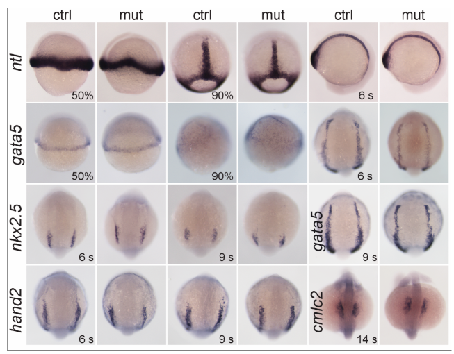 Gene expression patterns in control and smarce1-/- embryos for the indicated transcripts at the indicated stages (s = somites). Embryos at 50%, and 90% epiboly, dorsal views with anterior to the top. Embryos at 6-somite stage for ntl, lateral views. Embryos at 6-, 9- and 14-somite stage for gata5, hand2, nkx2.5 and cmlc2, dorsal views with anterior to the top.