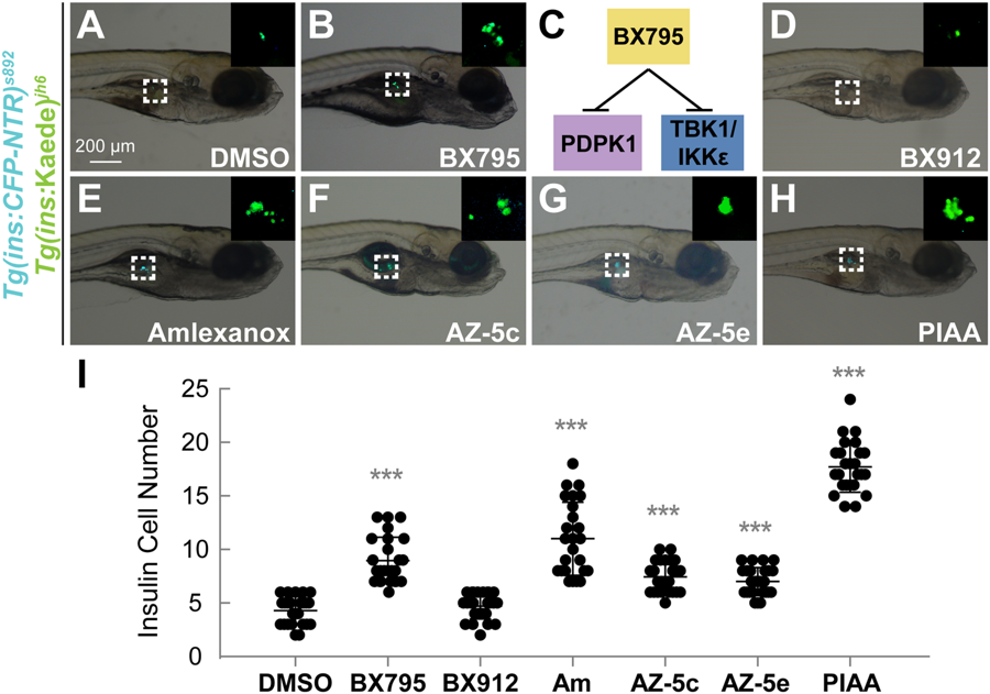 TBK1/IKKε inhibition augments β-cell regeneration in a zebrafish model of type 1 diabetes. (A, B, D–H) Bright-field images combined with fluorescent images showing the overall morphology and [Tg(ins:CFP-NTR)s892; Tg(ins:Kaede)jh6] expression (green) of larvae at 48 hpa treated with DMSO (A), BX795 (B), BX912 (D), amlexanox (E), AZ-5c (F), AZ-5e (G), and PIAA (H), respectively. While TBK1/IKKε-Is substantially expanded [Tg(ins:CFP-NTR)s892; Tg(ins:Kaede)jh6]-expressing cell population (white squares and insets) during regeneration (B and E–H) compared to DMSO (A), the PDPK1 inhibitor BX912 showed minimum effect (D). (C) BX795 is a dual inhibitor of PDPK1 and TBK1/IKKε. (I) Quantification of the number (mean ± SD) of total regenerated β-cells at 48 hpa (in A-B and D-H; 4.3 ± 1.3 (DMSO), 9.0 ± 2.2 (BX795), 4.7 ± 1.2 (BX912), 11.0 ± 3.4 (amlexanox), 7.4 ± 1.4 (AZ-5c), 7.0 ± 1.3 (AZ-5e), and 17.7 ± 2.4 (PIAA)). Cells in 20 planes of confocal images from 25 individual larvae were counted per condition. ***P < 0.001.