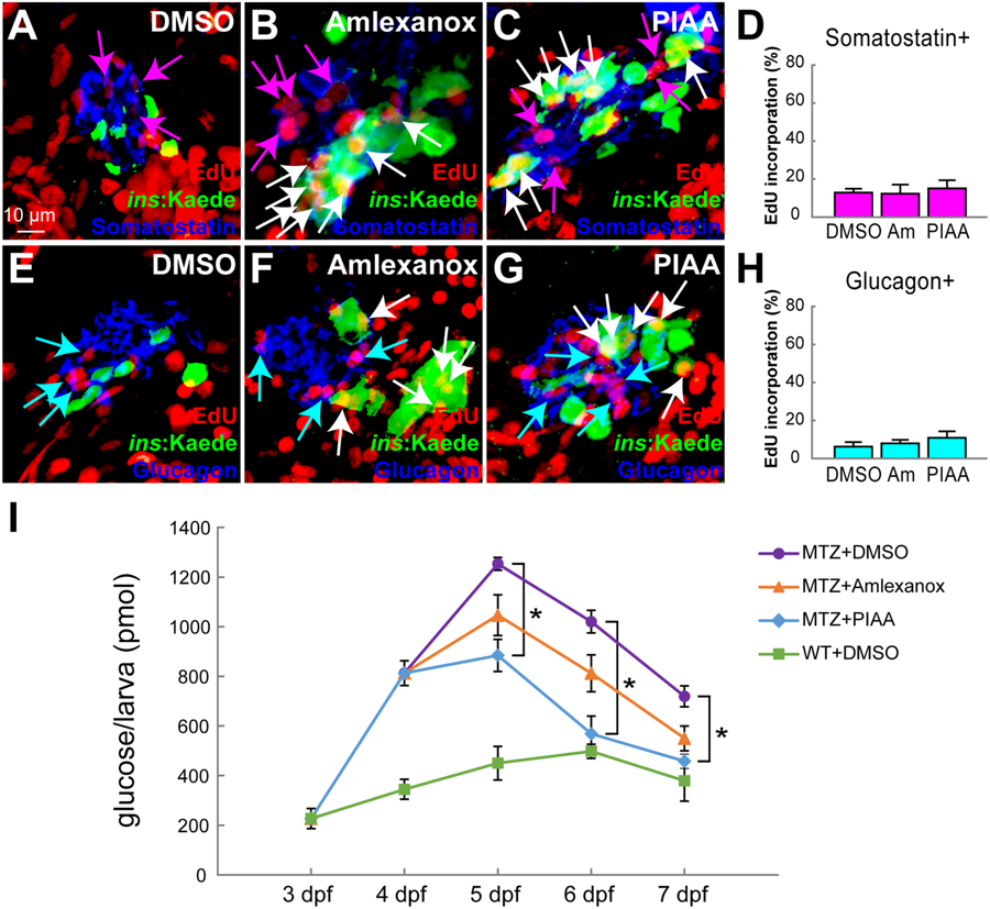 TBK1/IKKε inhibitors accelerate restoration of β-cell function by selectively increasing the number of β-cells. (A–C) Confocal images of [Tg(ins:CFP-NTR)s892; Tg(ins:Kaede)jh6] larvae at 48 hpa, concurrently treated with EdU and DMSO (A), amlexanox (B), or PIAA (C), respectively, from 0–48 hpa, stained for Somatostatin (blue). The number of Somatostatin-expressing δ-cells that incorporated EdU (purple arrows) did not increase in TBK1/IKKε-I-treated recovering larvae (B, C) compared to DMSO-treated larvae (A). (D) The percentage (mean ± SD) of δ-cells that incorporated EdU at 48 hpa (in A-C; 12.9 ± 2.0% (DMSO), 12.4 ± 4.7% (amlexanox), and 15.1 ± 4.3% (PIAA)). Cells in 20 planes of confocal images from 10 individual larvae were counted per condition. (E–G) Confocal images of [Tg(ins:CFP-NTR)s892; Tg(ins:Kaede)jh6] larvae at 48 hpa, concurrently treated with EdU and DMSO (E), amlexanox (F), or PIAA (G), respectively, from 0–48 hpa, stained for Glucagon (blue). The number of Glucagon-expressing α-cells that incorporated EdU (blue arrows) did not increase in TBK1/IKKε-I-treated recovering larvae (F, G) compared to DMSO-treated larvae (E). (H) The percentage (mean ± SD) of α-cells that incorporated EdU at 48 hpa (in E-G; 6.2 ± 2.4% (DMSO), 8.0 ± 1.9% (amlexanox), and 10.9 ± 3.4% (PIAA)). Cells in 20 planes of confocal images from 10 individual larvae were counted per condition. (I) Free-glucose levels (mean ± SD) during β-cell regeneration in non-ablated wild type, DMSO-treated recovering, and TBK1/IKKε-I-treated recovering larvae. At 7 dpf (equivalent to 72 hpa), free-glucose levels were significantly lower in PIAA-treated recovering larvae (blue line, 457.7 ± 28.8 pmol/larva) than in DMSO-treated larvae (purple line, 719.3 ± 42.2 pmol/larva). *P < 0.05. n = 30 larvae (3 pools of 10 larvae) per data point.