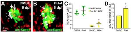 PIAA increases b-cell proliferation during normal development in zebrafish. (A-B) Confocal images of [Tg(ins:CFP-NTR)s892; Tg(ins:Kaede)jh6] larvae at 6 dpf, concurrently treated EdU and DMSO (A) or PIAA (B), respectively, from 4-6 dpf. A small but significant increase in EdU incorporation (white arrows) was observed in PIAA-treated larvae (B) compared to DMSO-treated larvae (A) during normal development. (C) Quantification of the number (mean±SD) of total b-cells (green dots) and b-cells that incorporated EdU (yellow dots) (in A-B; 38.0±3.2 total b-cells, of which 5.8±1.0 (DMSO) and 45.3±9.3, of which 11.0±3.6 (PIAA) incorporated EdU). (D) The percentage (mean±SD) of b-cells that incorporated EdU (in A-B; 15.2±2.7% (DMSO) and 23.8±3.4% (PIAA)). Cells in 20 planes of confocal images from 5 individual larvae were counted per condition. *, P < 0.05.