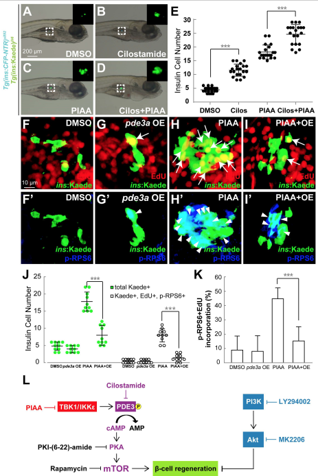 (A-D) Bright-field images combined with fluorescent images showing the overall morphology and [Tg(ins:CFP-NTR)s892; Tg(ins:Kaede)jh6] expression (green) of larvae at 48 hpa treated with DMSO (A), cilostamide (B), PIAA (C), and PIAA with cilostamide (D), respectively. The combination of cilostamide with PIAA resulted in increase in the [Tg(ins:CFPNTR) s892; Tg(ins:Kaede)jh6]-expressing cell population during regeneration (D) compared to individual treatment (B and C). The insets display magnified views of the pancreatic islets (outlined by the dashed squares). (E) Quantification of the number (mean±SD) of total regenerated b-cells at 48 hpa (in A-D; 4.5±1.0 (DMSO), 11.6±2.2 (cilostamide), 18.2±2.6 (PIAA), and 24.6±3.6 (cilostamide with PIAA). Cells in 20 planes of confocal images from 20 individual larvae were counted per condition. ***, P < 0.001. (F-I’) Confocal images of EdUadministered [Tg(ins:CFP-NTR)s892; Tg(ins:Kaede)jh6] larvae at 48 hpa, treated with DMSO (F and F’) and PIAA (H and H’), respectively, or induced pde3a expression upon b-cell ablation (G and G’) and pde3a expression upon b-cell ablation in the presence of PIAA (I and I’), respectively, from 0-48 hpa, stained for pRPS6 (blue). The number of EdU-incorporated (white arrows) and pRPS6-positive (white arrowheads) b-cells was increased in recovering larvae treated with PIAA (H and H’) compared to DMSO-treated larvae (F and F’). When pde3a expression was induced upon b-cell ablation, PIAA-dependent increases in the number of EdUincorporated and pRPS6-positive b-cells were suppressed (I and I’). (J) Quantification of the number (mean±SD) of total regenerated b-cells (green dots) and regenerated b-cells that incorporated EdU with pRPS6 immunoreactivity (white dots) at 48 hpa (in F-I’; 4.8±1.2 total regenerated b-cells, of which 0.5±0.5 (DMSO), 4.0±1.0, of which 0.4±0.5 (pde3a overexpressing), 17.8±2.8, of which 8.0±1.9 (PIAA), and 8.0±2.8, of which 1.4±1.1 (pde3a overexpressing in the presence of PIAA) incorporated EdU with pRPS6 immunoreactivity). (K) The percentage (mean±SD) of regenerated b-cells that incorporated EdU with pRPS6 immunoreactivity at 48 hpa (in F-I’; 8.9±9.8% (DMSO), 8.0±11.0% (pde3a overexpressing), 44.8±7.6% (PIAA), and 15.3±9.9% (pde3a overexpressing in the presence of PIAA)). Cells in 20 planes of confocal images from 10 individual larvae were counted per condition. ***, P < 0.001. (L) A model depicting the cAMP-PKA-mTOR signaling cascade via PDE3 that mediates b-cell regeneration in response to TBK1/IKKε inhibition. The site of action of PIAA is shown in red, while those of LY294002 and MK2206 in blue, and cilostamide in purple.