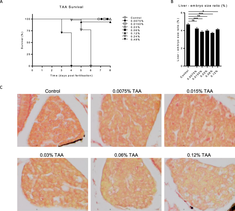Thioacetamide titration in zebrafish embryos. Zebrafish embryos (2dpf) were treated until 8dpf with different concentrations of TAA in egg water. (A) Survival of the embryos during TAA treatment (N = 50 embryos). (B) At 8dpf the embryos were imaged to measure the sizes of the liver and total embryo in order to calculate the liver to embryo size ratio (N = 2, ±SEM). (C) Sirius-red stained section of TAA treated zebrafish embryo livers (8dpf, 400x magnification). *p ≤ **p ≤ 0.01, ***p ≤ 0.001.