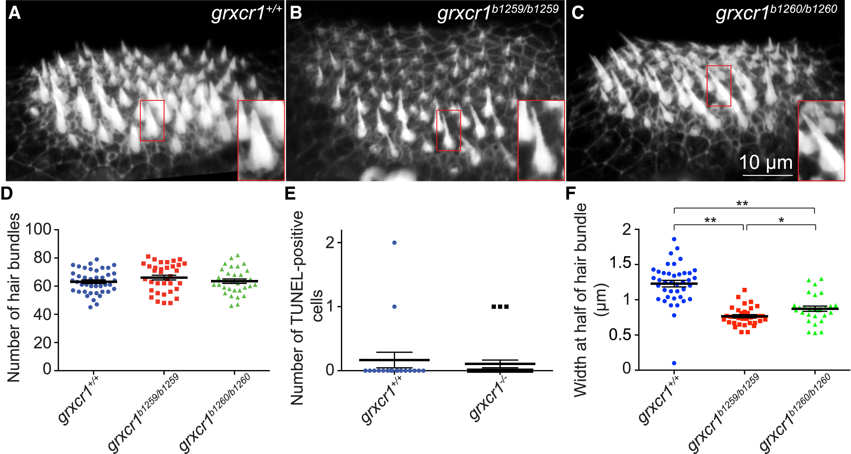 (F) Average hair bundle width at half their height in grxcr1+/+ (n = 40 larvae), grxcr1b1259/b1259 (n = 34 larvae), and grxcr1b1260/b1260 mutant larvae (n = 36 larvae).