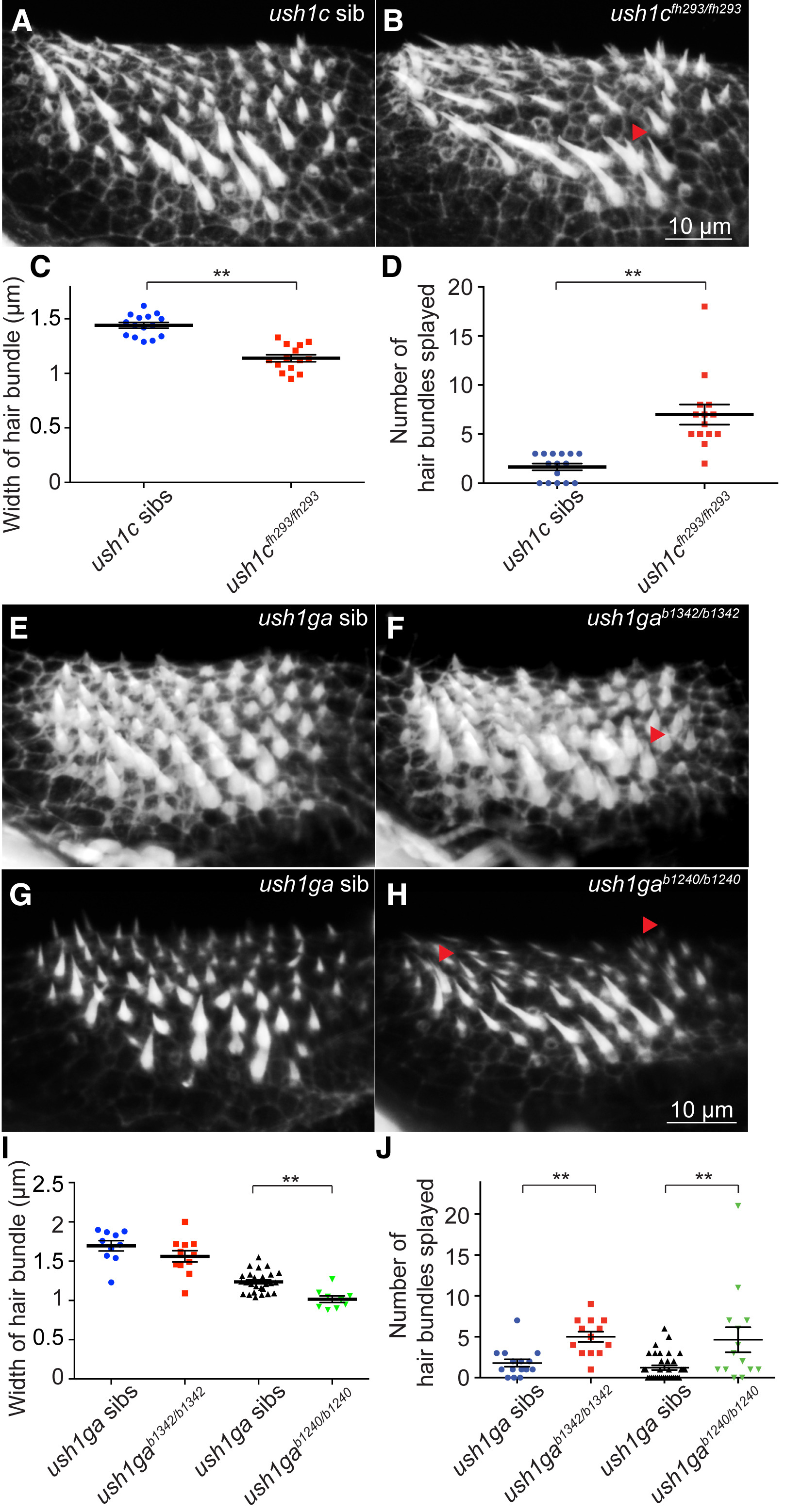 (I) Average hair bundle width at half their height in ush1gab1342 siblings (n = 10 larvae), ush1gab1342/b1342 (n = 11 larvae), ush1gab1240 siblings (n = 28 larvae), and ush1gab1240/b1240 mutant larvae (n = 9 larvae).