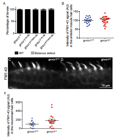 Mechanosensation is not affected in grxcr1 mutants. Related to Figure 2. (A) Percentage of larvae responding correctly to the startle response test or with a balance defect. The number of larvae analyzed was as follow: 104 grxcr1+/+, 121 grxcr1+/b1259, 43 grxcr1b1259/b1259, 112 grxcr1+/b1260, 70 grxcr1b1260/b1260. (B) Average intensity of FM1-43 signal within the hair bundles of inner ear hair cells in grxcr1+/+ (n=20 larvae) and grxcr1-/- (n=22 larvae). Incorporation of FM1-43 in the hair bundles of the hair cells of the anterior macula at 5 dpf in grxcr1+/+ (C) and grxcr1-/- (D). (E) Average intensity of FM1-43 signal within the hair bundles of neuromast hair cells in grxcr1+/+ (n=20 larvae) and grxcr1-/- (n=22 larvae). Data were normalized to grxcr1+/+. Data are represented as mean ± SEM.