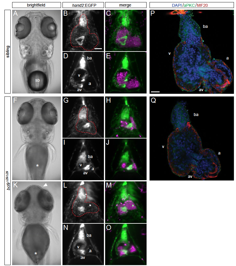(A-O) SPIM images of hand2:EGFP;drl:mCherry-expressing wildtype siblings and homozygous bcl9Δ29 embryos at 5 dpf; ventral views, anterior to the top, imaged after viable heart-stopping BDM treatment, two individual bcl9Δ29-mutant embryos are shown. A,F,K, bright field views to illustrate the absent swimbladder in mutants (sb, asterisks in F,K) and different expressivity of craniofacial defects (arrowhead, K); B-O maximum-intensity projection fluorescence close-ups of the heart (red dotted outlines in B,G,L); D,E,I,J,N,O depict optical sections at AV canal level. (P,Q) Confocal sections of sibling control (P) and homozygous bcl9Δ29 (Q) hearts, dissected and stained at 5 dpf to reveal the details of cardiac architecture. Also compare to Figure 2. ba, bulbus arteriosus; a, atrium; v ventricle; av, atrioventricular canal. Scale bars B-E,G-J,L-O 100 m, S,T 20 m.