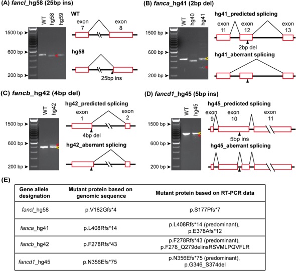 (A-D) WT and mutant allele RT-PCR products resolved on 2% agarose gel are shown in the left panels and splicing aberrations are depicted in the right panels. (A) The observed RT-PCR product for fancl_hg58 mutant was smaller in size (red arrow) than expected based on the 25 bp insertion in exon 8. The sequence of the hg58 product showed shift in its splice acceptor site resulting in loss of 48 bp sequence, that includes 23 bp from exon 8 beginning and CRISPR/Cas9 induced 25 bp insert. (B-D) Partial activation of cryptic splice site near the indel mutation was observed in fanca_hg41, fancb_hg42 and fancd1_hg45 mutant alleles. The RT-PCR products for these mutants showed two bands, one matched expected size (yellow arrows) and the other was from an altered splice product (red arrows). PCR products were cloned and sequenced to determine aberrant splice product sequence. In hg41 mutant, the indel mutation (2 bp del) in exon 12 results in partial skipping of mutated exon (B). In hg42 mutant, the indel mutation (4 bp del) in exon 1 results in partial use of new splice donor site in intron 1 (C). In hg45 mutant, the indel mutation (5 bp ins) in exon 10 results in partial use of new splice acceptor and donor in exon 10 (D). (E) The consequence on the predicted encoded protein based on the genomic indel mutation, and the observed aberrant splice product for all four mutant lines are shown. RT-PCR gel image data for all 36 alleles is shown in S3A Fig.