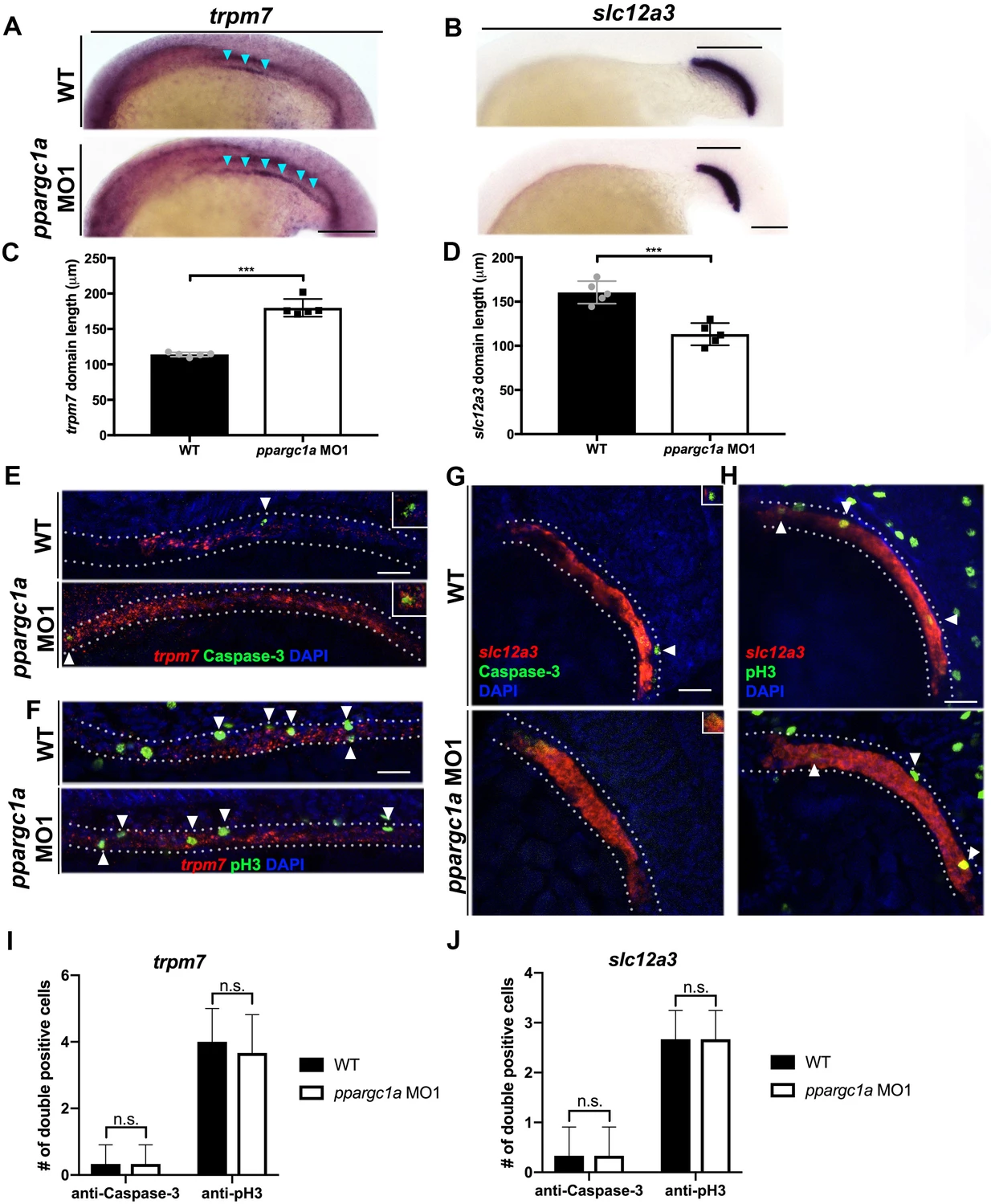 Fig. 3 Loss of ppargc1a does result in segment changes at the 20 ss but no change in cellular turnover is observed. (A) WISH at the 20 ss for trpm7 (left) and (B) slc12a3 (right) in WT (top) and ppargc1a MO (bottom). Blue arrowheads indicate trpm7 expression in the developing pronephros. Scale bar = 100 μm. The representative graphs showing absolute length measurements of trpm7 (C) and slc12a3 (D). (E) FISH/IHC for trpm7 (red) and anti-Caspase-3 (green) with DAPI (blue) in WT (top) and ppargc1a MO1 (bottom). (F) FISH/IHC for trpm7 (red) and anti-phospho-Histone H3 (green) in WT (top) and ppargc1a MO1 (bottom). (G) FISH/IHC for slc12a3 (red) and anti-Caspase-3 (green) with DAPI (blue) in WT (top) and ppargc1a MO1 (bottom). (H) FISH/IHC for slc12a3 (red) and anti-phospho-Histone H3 (green) with DAPI (blue) in WT (top) and ppargc1a MO1 (bottom). (I) The number of trpm7/Caspase-3 or trpm7/pH3 double-positive cells is depicted. (J) The number of slc12a3/Caspase-3 or slc12a3/pH3 double positive cells is depicted. (WT quantifications = black bars, ppargc1a-deficient quantifications = white bars.) Data are represented as ±SD, significant by t test, n.s. = not significant, *** = p < 0.001.