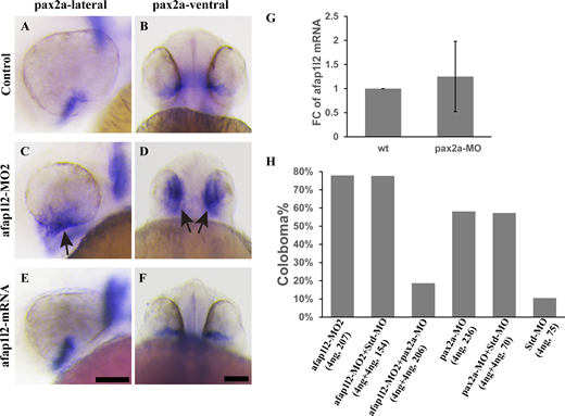 Fig. 6 afap1l2 controls OF closure by regulating pax2a expression. (A–F) ISH of pax2a in the eyes of control, afap1l2-morphant, and afap1l2-overexpressing zebrafish at 36 hpf. (A, B) Lateral views; (C, D) ventral views. (G) qPCR comparison of afap1l2 expression levels in the eyes of wild-type and pax2a-morphant zebrafish. FC: fold change. (H) Quantification of incidences of coloboma phenotype of afap1l2-MO and pax2a-MO coinjection. Numbers in parentheses denote dosage of the morpholinos used and the number of zebrafish injected. The scale bars in (E, F) are both 100 μm, and they apply to (A, C, E) and to (B, D, F), respectively.