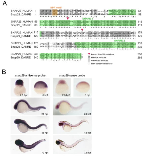Snap29 conservation and expression in zebrafish. (A) Protein sequence alignment of human and zebrafish Snap29 from UniProt. Red triangles refer to two SNAP29 mutations described in CEDNIK patients. Amino acid residues are shaded according to their degree of conservation, as described in the legend. (B) Whole-mount in situhybridization with snap29 antisense and sense probes on zebrafish embryos at the indicated developmental stages.