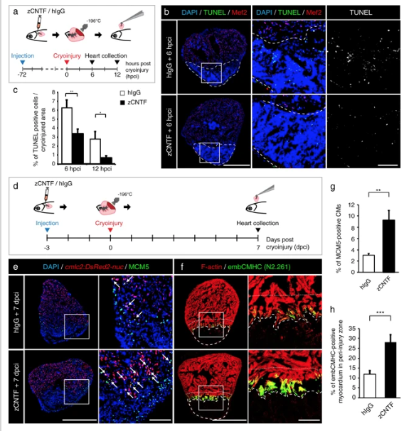 Administration of zCNTF reduces apoptosis and boosts initiation of heart regeneration after cryoinjury. a Experimental design for the apoptosis assay. zCNTF was injected into the pericardial cavity 72 h before cryoinjury. Hearts were collected at 6 and 12 h post-cryoinjury (hpci). b Transversal heart sections at 6 hpci stained for apoptotic cells using the TUNEL assay (green) and a myocyte nuclear marker Mef2 (red). Cryoinjured zone is encircled with a dashed line. Scale bar for the whole section, 500 μm; for the magnified area, 100 μm. cQuantification of TUNEL-positive nuclei at 6 and 12 hpci, in hearts injected with control proteins and zCNTF. n ≥ 4 hearts; ≥ 2 sections per heart; *P < 0.05; **P < 0.01. d Experimental design for assessment of the initiation of regeneration. zCNTF was injected into the pericardial cavity at 3 days before cryoinjury (dpci). Hearts were collected at 7 dpci. e, fImmunofluorescence staining of heart sections. Scale bar for the whole section, 500 μm; for the magnified area, 100 μm. e Transversal heart sections of transgenic fish cmlc2:DsRed2-nuc immunstained for MCM5 (green) display an enhanced number of proliferating CMs (arrows) after zCNTF injection. f Transversal heart sections of zCNTF/hIgG injected wild type fish immunostained for embCMHC (N2.261, green) and F-actin (red) comprise more abundant expression of embCMHC in the peri-injured ventricle within a distance of 100 μm from the wound tissue, which is delineated with a dotty line. g Quantification of MCM5-positive cardiac nuclei in hearts injected with control proteins and zCNTF. n ≥ 4 hearts; ≥ 2 sections per heart; *P < 0.05; **P < 0.01. h Proportion of the embCMHC-positive myocardium within the 100 μm peri-injury zone in hearts injected with control proteins and zCNTF. n ≥ 4 hearts; ≥ 2 sections per heart; ***P < 0.001