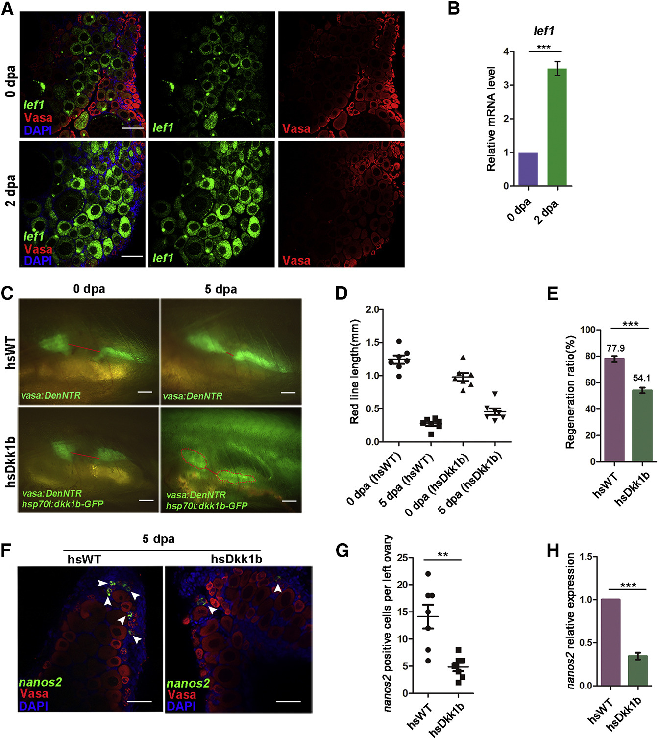 (F) Triple fluorescent labeling with nanos2 RNA probe, Vasa antibodies, and DAPI staining both in the hsWT and hsDkk1b fishes at 5 dpa. Arrowheads point to GSCs.