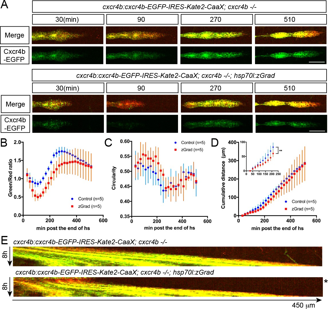 (A) Maximum-projected confocal images of the primordia in heat-shocked cxcr4b:cxcr4b-EGFP-IRES-Kate2-CaaX-p7; cxcr4b-/- embryos transgenic for hsp70l:zGrad (lower panels) or not (upper panels) at indicated time in min after the end of heat shock (31 hpf). Scale bar: 50 µm. (B) Quantification of Cxcr4b-EGFP-to-Kate2-CaaX ratios in the primordia of control (blue) and zGrad-expressing embryos (red) after the end of heat shock in min. Mean and SD are indicated. (C) Quantification of circularity of the primordia of control (blue) and zGrad-expressing embryos (red) after the end of heat shock in min. Mean and SD are indicated. (D) Quantification of the cumulative primordium migration distance in control (blue) and zGrad-expressing embryos (red) after the end of heat shock in min. Mean and SD are indicated. Inset shows magnification of the 30 min to 240 min time interval. **=p < 0.01. (E) Kymograph of the primordia in heat-shocked cxcr4b:cxcr4b-EGFP-IRES-Kate2-CaaX-p7; cxcr4b-/- embryos transgenic for hsp70l:zGrad (bottom) or not (top). Cxcr4b-EGFP is shown in green and Kate2-CaaX in red. Asterisk indicates the time interval in which Cxcr4b-EGFP is transiently degraded and the primordium transiently ceases to migrate