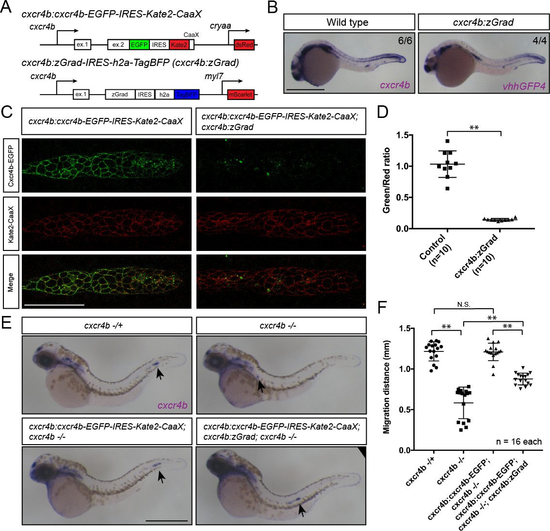 (A) Schematic of strategy to assess zGrad-mediated Cxcr4b-EGFP degradation in the primordium on primordium migration. (B) In situ hybridization against cxcr4b mRNA in a wildtype embryo and against zGrad mRNA in a cxcr4b:zGrad embryo at 24hpf. Scale bar: 0.5 mm. (C) Single-plane confocal images of the primordium in cxcr4b:cxcr4b-EGFP-IRES-Kate2-CaaX-p1 control (left) and cxcr4b:cxcr4b-EGFP-IRES-Kate2-CaaX-p1; cxcr4b:zGrad embryos (right) at 36 hpf. Note that the embryos are cxcr4b +/- or cxcr4b -/-. Scale bar: 50 µm. (D) Quantification of Cxcr4b-EGFP to Kate2-CaaX fluorescence intensity ratio in the primordia of control embryos (blue) and embryos expressing zGrad in the primordium at 36 hpf. Mean and SD are indicated. **=p < 0.01. (E) In situ hybridization against cxcr4b mRNA in cxcr4b-/+ (top left), cxcr4b-/- (top right), cxcr4b:cxcr4b-EGFP-IRES-Kate2-CaaX-p1; cxcr4b-/- (bottom left) and cxcr4b:cxcr4b-EGFP-IRES-Kate2-CaaX-p1; cxcr4b-/-; cxcr4b:zGrad embryos (bottom right) at 38 hpf. Arrows indicate the location of the primordium. Scale bar: 0.5 mm. (F) Quantification of primordia migration distance of the indicated genotypes at 38 hpf. Mean, SD and n are indicated. **=p < 0.01, N.S. = p > 0.05