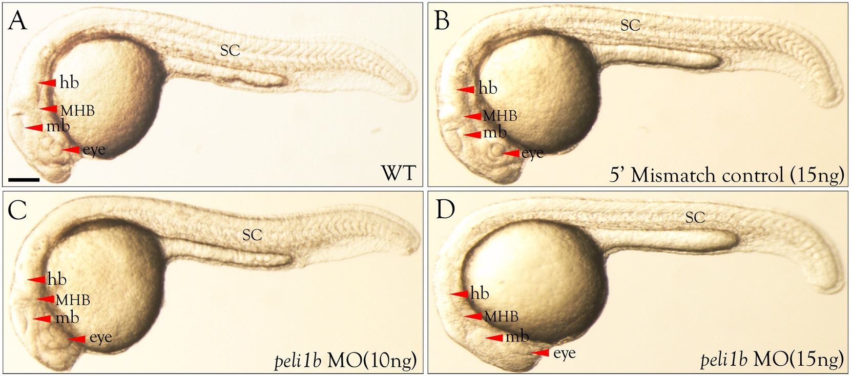 Morphological defects in zebrafish embryos after knockdown of peli1b. All images were taken at 24 hpf. (A) WT, (B) 5′ mismatch control, (C) peli1b MO (10 ng), and (D) peli1b MO (15 ng). Morpholino and 5′ mismatch control were injected at the 1-cell stage in synchronized embryos. (A–D) Lateral view of the embryos showing the phenotype after 10 ng or 15 ng injection of peli1b antisense nucleotidemorpholino. Abbreviations: NT, neural tube; SC, spinal cord; fb, forebrain; mb, midbrain; hb, hindbrain; MHB, midbrain–hindbrain boundary. (n = 3). Scale bar- 50 μm.