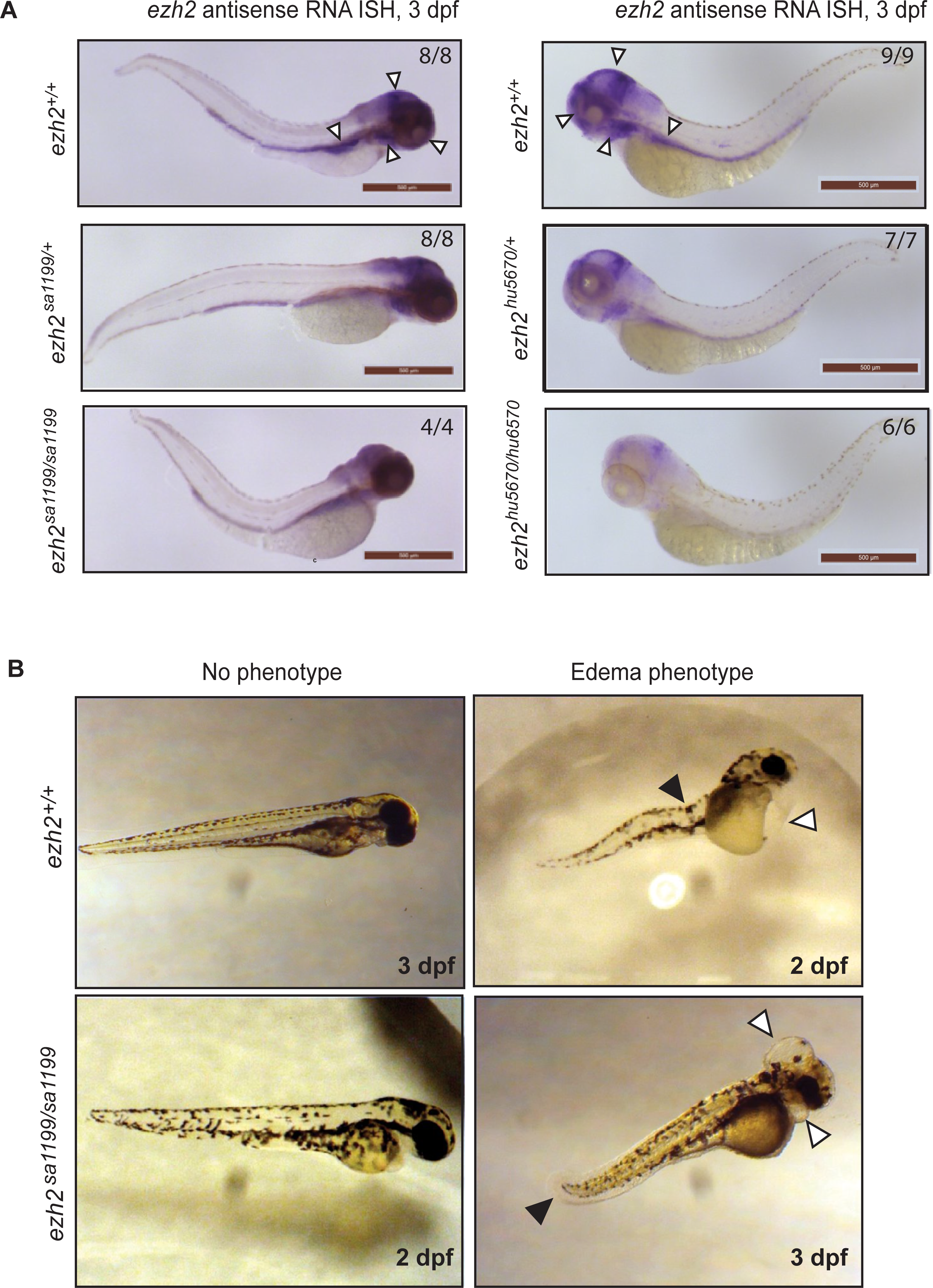 A. Whole mount in-situ hybridization for ezh2 on 3 dpf ezh2(sa1199) (left panel) and ezh2(hu5670) (right panel) embryos. Left panel. Wild type siblings (top) show ezh2expression in the brain, eyes, branchial arches, and the gut (white arrowheads). Heterozygotes (middle) and ezh2(sa1199) mutants (bottom) show the same expression pattern; they are phenotypically comparable to wild types and have the same spatiotemporal ezh2 expression pattern. Right panel. Wild type siblings (top) show similar ezh2 expression to ezh2(sa1199) in-cross embryos (white arrowheads). Heterozygotes (middle) show decreased expression, and ezh2 is barely detectable in ezh2(hu5670) mutants (bottom). Scale bar: 500 μm. Numbers indicate the number of embryos displaying the shown expression pattern per total number of embryos tested. B. Left panel shows normal wild type and mutant embryos at 3 and 2 dpf, respectively. The right panel shows 2 and 3 dpf wild type and mutant embryos, respectively, with yolk sac, heart, and brain edemas (white arrowheads) and spinal curvatures (black arrowheads).