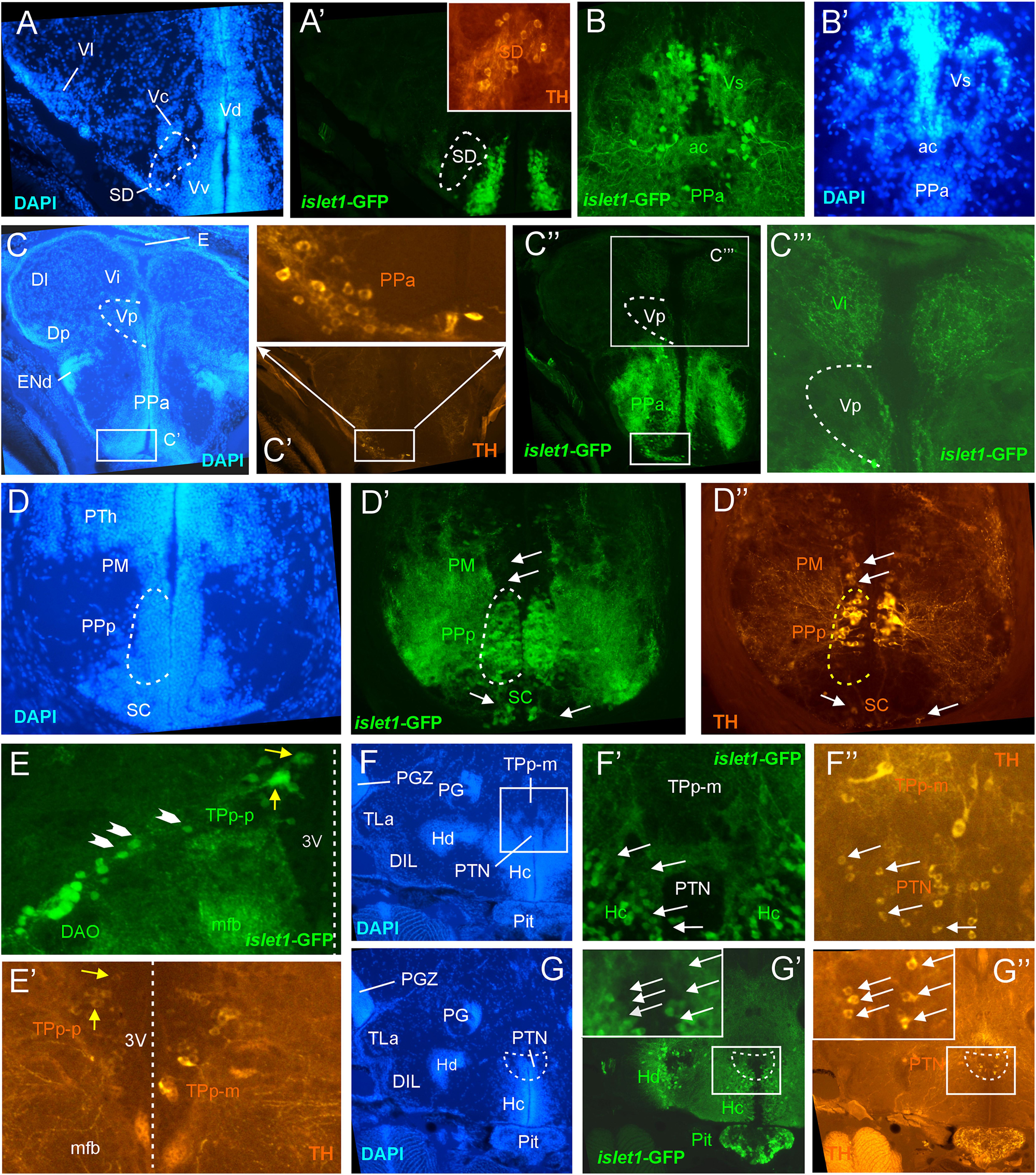 Details of islet1-GFP expression using fluorescent DAPI stain and tyrosine hydroxylase (TH) immunohistochemistry. Conventions with lettering as in Figure 1. (A,A’) islet1 expression in precommissural subpallium shows positivity in ventral, and negativity in central (Vc) and lateral nuclei (Vl). (B,B’) islet1-GFP expression in supracommissural nucleus (Vs). (C–C”’) islet1-GFP fibers in intermediate nucleus of the ventral telencephalon. Note also TH cells in the anterior parvocellular preoptic nucleus (PPa). (D–D”) Dopamine cells in magnocellular (PM), posterior parvocellular (PPp), and suprachiasmatic nuclei (SC), with only cells in PPp double-labeled for islet1-GFP. (E) Origin of the dorsal accessory optic nucleus (DAO) as suggested by a chain of islet1-GFP cells (arrowheads) that apparently migrate pially from the parvocellular periventricular posterior tubercular nucleus (TPp-p) and merge into the DAO. Straight stippled line indicates midline. (E’) Slightly more medially taken picture shows the parvocellular (TPp-p) and pear-shaped (TPp-m) parts of TPp on both brain sides in TH immunostaining. Note that some cells in TPp-p are double-labeled. (F–G) Analysis of anterior part of caudal zone of periventricular hypothalamus (Hc) and posterior tuberal nucleus (PTN) at rostral (F: DAPI, F’: islet1-GFP, F”: TH stain) and caudal levels (G: DAPI, G’: islet1-GFP, G”: TH stain). Note that there are no TH and islet1-GF double-labeled cells in PTN. ac, anterior commissure; DAO, dorsal accessory optic nucleus; DIL, diffuse nucleus of the inferior lobe; Dl, lateral zone of dorsal telencephalon; Dm, medial zone of the dorsal telencephalon; DP, dorsal posterior thalamic nucleus; E, epiphysis (pineal); ENd, dorsal entopeduncular nucleus; Hc/Hd, caudal/dorsal zone of periventricular hypothalamus; mfb, medial forebrain bundle; PG, preglomerular complex; PGZ, periventricular gray zone of optic tectum; Pit, pituitary; PM, magnocellular preoptic nucleus; PPa/PPp, anterior/posterior parvocellular preoptic nucleus; PTh, prethalamus; PTN, posterior tuberal nucleus; TLa, torus lateralis; TPp-m/TPP-p, magnocellular (pear-shaped)/parvocellular cell part of periventricular posterior tubercular nucleus; Vc/Vd/Vi/Vl/Vp/Vs/Vv, central/dorsal/intermediate/lateral/posterior/ supracommissural/ventral nucleus of ventral telencephalon; SC, suprachiasmatic nucleus; SD, subpallial dopamine cells; VI, abducens nerve.