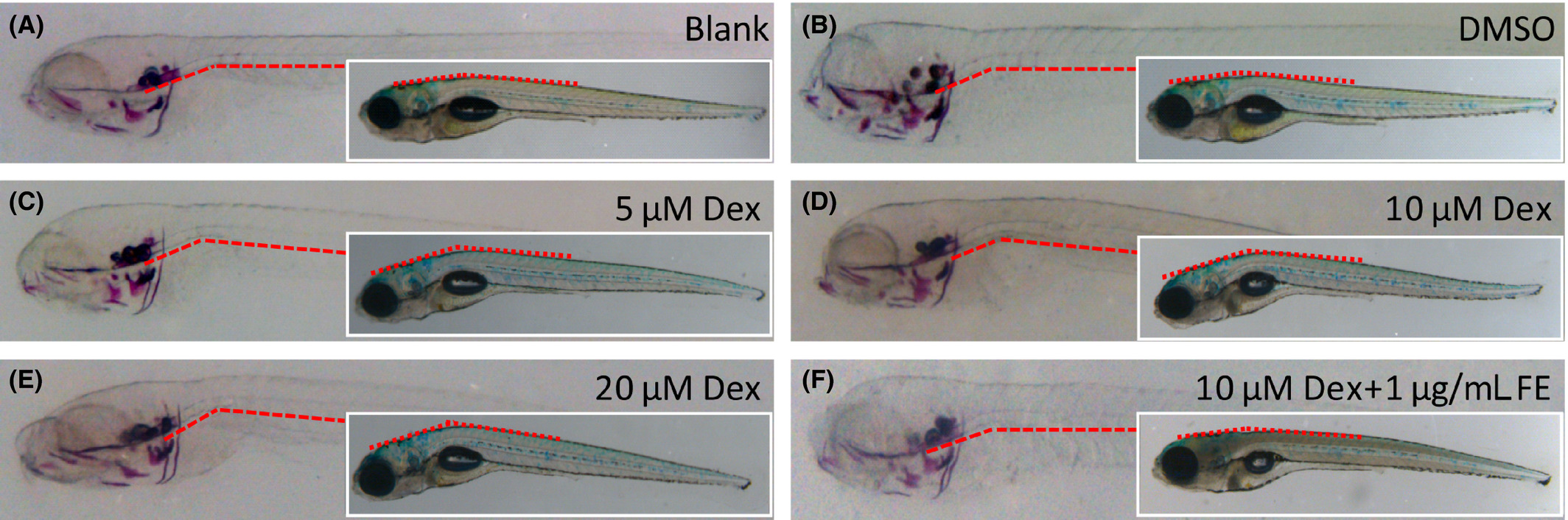 Morphologies of zebrafish larvae after Dex induction or FE treatment. In blank and DMSO‐treated control groups, zebrafish display a straight fish body (A, B). In Dex‐induced OP models, the larvae show a bent body and a curve at the link point of the head and trunk region as depicted by the red dash lines. This impairment is exacerbated by the increase in the Dex concentration from 5 μM to 20 μM (C‐E). (F), 1 μg/mL FE treatment rescues the impaired morphology observed in OP‐like fish
