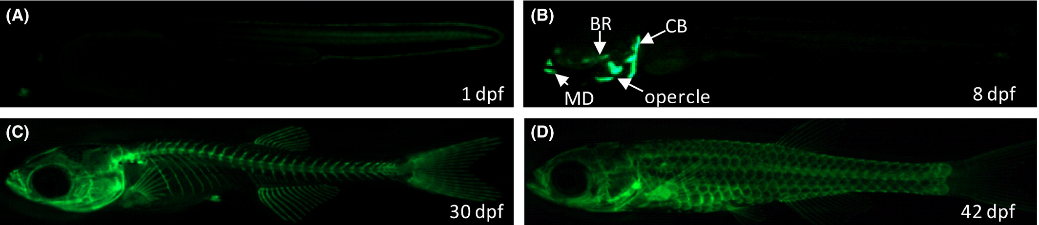 eGFP expression patterns in Tg(ola.sp7:nlsGFP) zebrafish. (A), At 1 d postfertilization (dpf), GFP is weakly expressed in the posterior trunk and tail regions. (B), Until 8 dpf, GFP‐labeled osteoblasts are detectable in ceratobranchial, opercle, branchiostegal rays, and mandible of the head region. (C), The rostral skeleton, axial skeleton, fin, and tail vertebral columns are clearly labeled by eGFP in 30 dpf juvenile fish. (D), Fluorescent fish scales are visible in 42 dpf transgenic fish. CT, cleithrum; BR, branchiostegal rays; MD, mandible