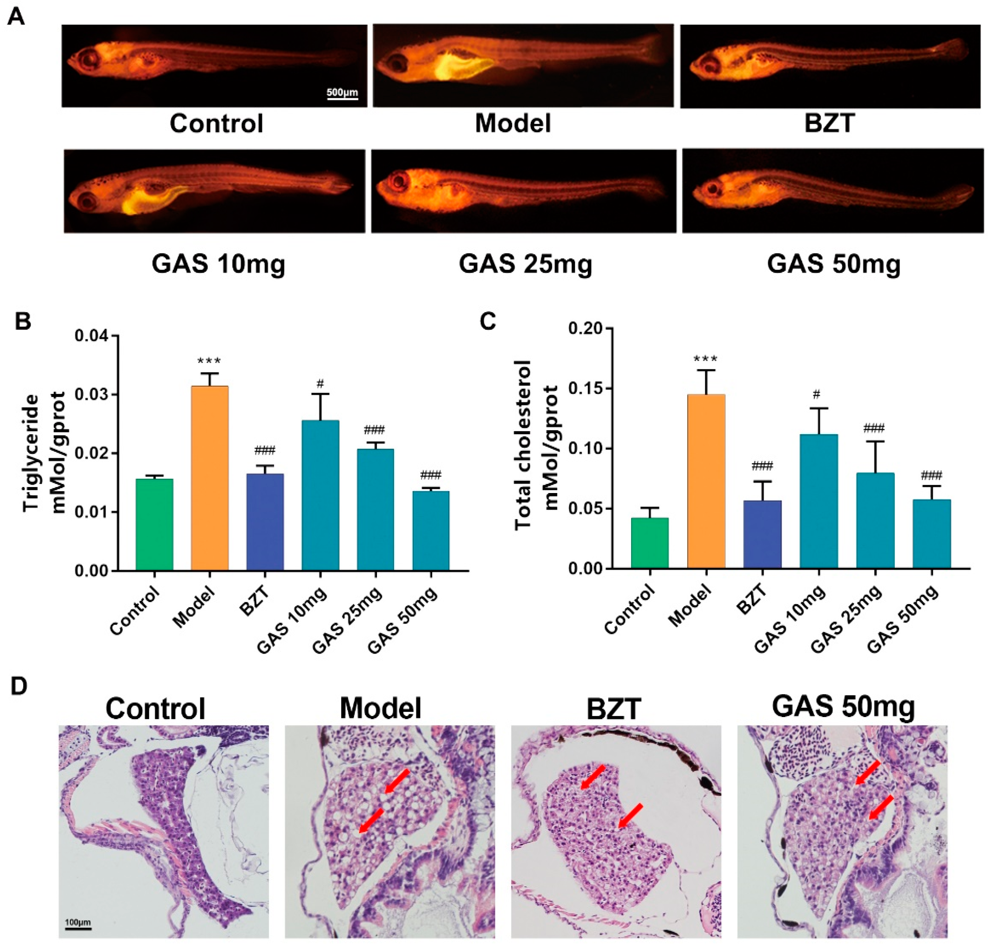 Lipid is regulating the effect of GAS on HCD induced larval zebrafish. (A) Nile red stain of larval zebrafish; (B) Triglyceride (TG) levels; and (C) total cholesterol (TC) levels of larval zebrafish in each group. (D) hematoxylin and eosin (HE) staining of larval zebrafish liver, macrovesicular steatosis and the differences mentioned with red arrows. Bar indicate means ± SD. *** p < 0.001 represent compared with the control. # p < 0.05, ### p < 0.001 represent compared with Model. p < 0.05 was considered as statistically significant, calculated by One-way ANOVA, followed by Tukey’s test. (n = 30).