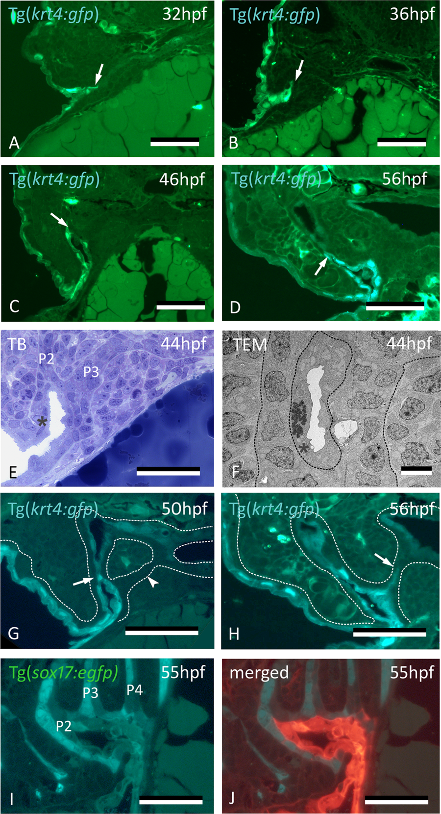 Peridermal cells sequentially invade pouches 2 to 6 but do not reach the midline endoderm. (A–C) krt4+ cells are present in progressively deeper parts of pouch 2 (P2) (arrows). (D) Peridermal cells are arrested approximately halfway the pouch (arrow). (E,F) At 44 hpf P2 is open to the exterior. Peridermal cells extend inside the pouch (black stars); a lumen forms only where these cells cover the endodermal layer. In (F), outer dotted lines mark contour of the pouch; inner dotted line marks contour of peridermal cells. (G) While peridermal cells have entered through P2 (arrow), krt4+ cells remain excluded from P3 (arrowhead) and more posterior pouches. (H) At 56 hpf, peridermal cells have started to enter P3 (arrow), and progressively extend inwards. (I,J) Double transgenics Tg(sox17:egfp;krt4:tomato) show opening of P2 with periderm entering and covering sox17+ endodermal cells (I, green channel only; J, overlay). P2–P6: pouches 2 to 6. (A–H) cross sections, (I,J) sagittal sections. TB: toluidine blue staining. Scale bars (A–E) and (G–J) = 50 μm, (F) = 5 μm.