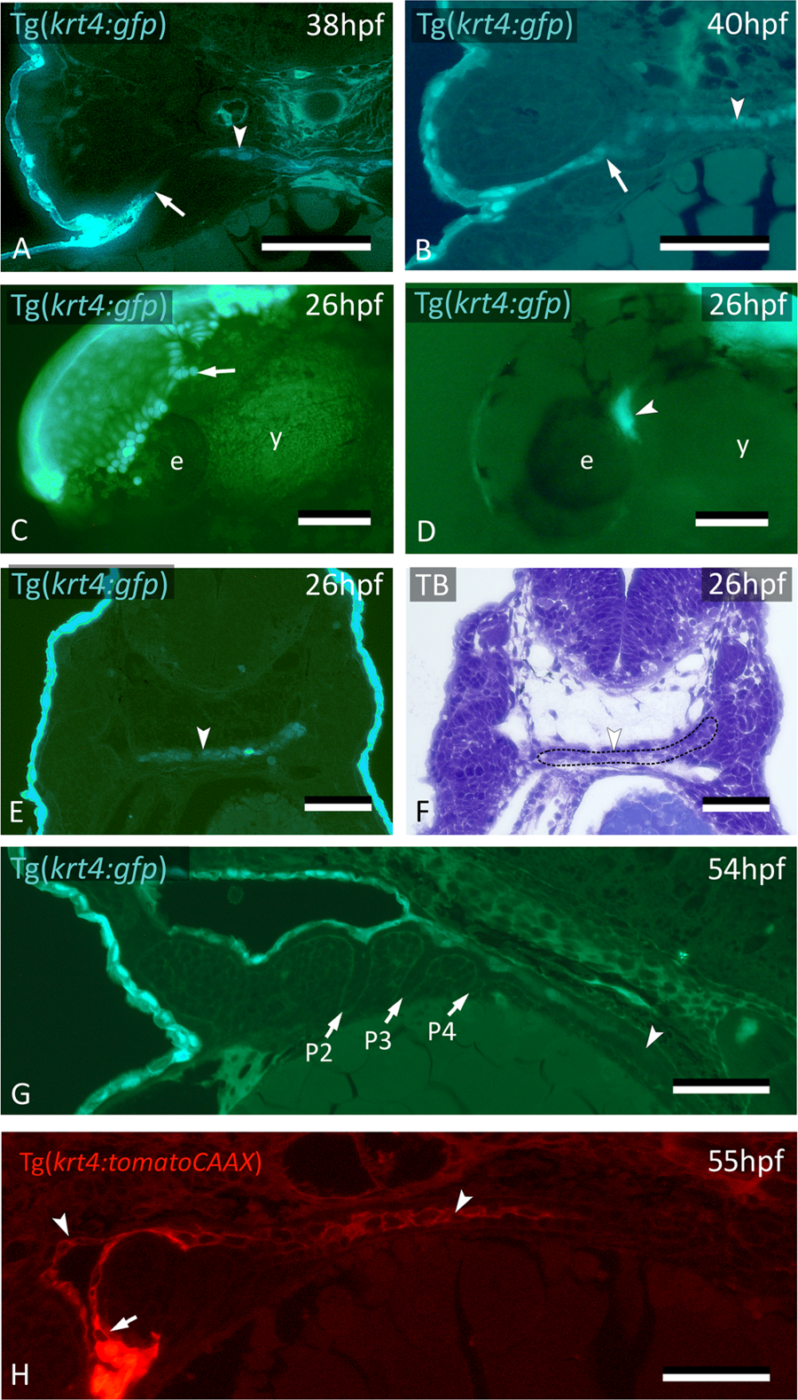 krt4+ cells expand along the midline and connect to invaded peridermal cells. (A) At 38 hpf, krt4+ cells are visible along the midline (arrowhead), separated from invading peridermal cells (arrow). (B) Shortly after, the midline krt4+ cells (arrowhead) make contact with peridermal cells that have entered through P2 (arrow). (C) Lateral view on Tg(krt4:gfp) embryo in the early phase of periderm removal with EDTA. Part of the periderm is still attached (arrow). (D) At an advanced stage of EDTA treatment, the periderm is completely removed, and an internal krt4+ structure has become visible (arrowhead). (E,F) This internal krt4+ structure (arrowhead on E) coincides with the midline endoderm at the level of pouch 1–2 (arrowhead on F). (G) By 54 hpf, midline krt4+ cells cover the entire pharynx lining (boundary indicated by arrowhead). P2 is wide open (at another level of sectioning) but other pouches (P3–P6) are still free of krt4+ cells. (H) Double transgenic embryo Tg(sox17:egfp;krt4:tomato) of 55 hpf shows lining of pharyngeal epithelium with krt4+ cells (arrowheads) (red channel only). Note continuity, albeit with sharp boundary (arrow), with peridermal cells entering via P2. (A,B,E,F) Cross sections; (C,D) whole mount embryos; (G,H) sagittal section. TB: toluidine blue staining. e: eye; y: yolk; P2–P6: pouches 2 to 6. Scale bars (A,B,E–G) = 50 μm; (C,D) = 100 μm; (H) = 20 µm.