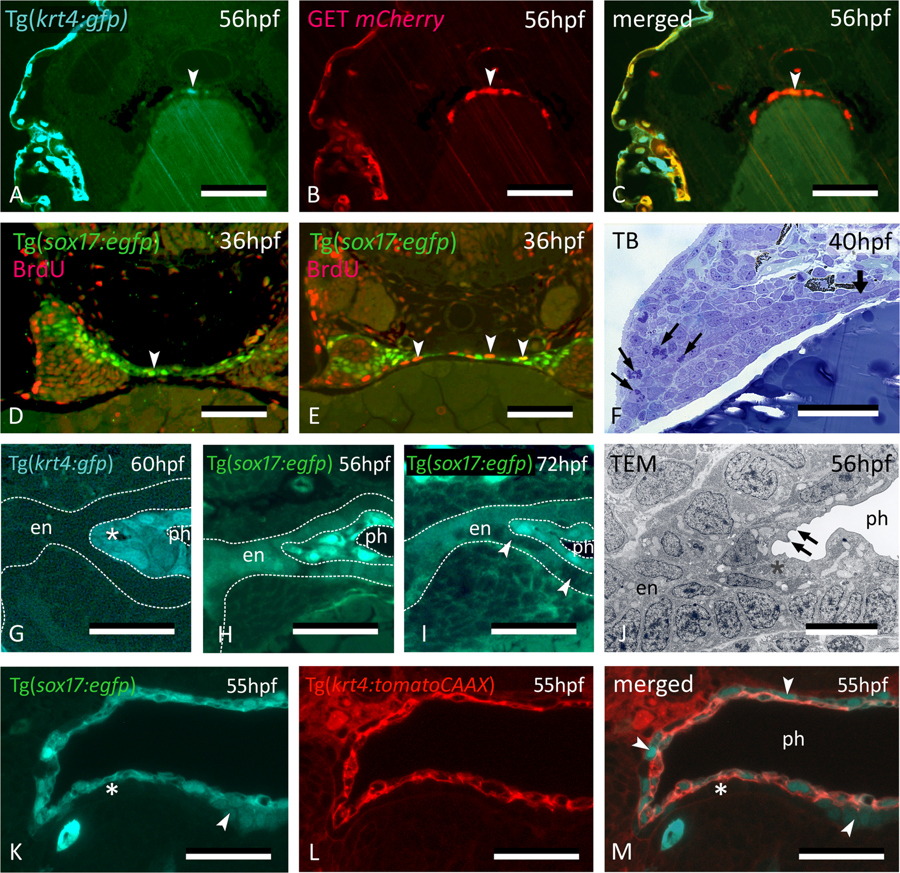 Midline krt4+ cells are distinct from peridermal and endodermal cells. (A–C) In embryos of GET-periderm x Tg(krt4:gfp) line, at 56 hpf, both the periderm and the midline krt4+ cells (arrowhead) strongly express mCherry in patterns overlapping with the krt4:GFP + cells. (D,E) Mitoses (arrowheads) revealed by BrdU pulse labeling at 36 hpf in the midline endoderm at more anterior (D) and posterior (E) cross sectional level. (F) Abundant mitoses in the distal part of the pouch (arrows) but not in the midline endoderm (thick arrow). (G) Midline cells (star) maintain a strong krt4+ expression at 60 hpf. (H,I) Downregulation of sox17+ expression in the endodermal layer (delimited by the outer dotted line in H, and by arrowheads in I) but upregulation in the superficial layer surrounding the pharyngeal lumen (delimited by inner two dotted lines). (J) Cells of the superficial layer are flattened and more electron-dense in TEM than the basal endodermal layer, composed of cuboidal cells, and they develop microridges (arrows). Epidermis to the left; midline to the right. (K–M) Double transgenic embryo Tg(sox17:egfp;krt4:tomato) of 55 hpf; krt4+ cells are positive for sox17; conversely, only some cells of the basal endodermal layer have retained a sox17 signal (arrowheads). (A–M) cross sections. en: endodermal layer; ph: pharyngeal lumen; TB: toluidine blue staining. Scale bars (A–F) = 50 μm, (G–I) = 25 µm, (J–M) = 10 µm.