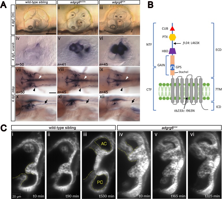 (A) Top, wild-type (WT) sibling: bright-field image of 4 dpf embryo stained with mbp. Dorsal view, anterior to the left. Blue box indicates the region of interest (ROI) used for the quantification of the left and right posterior lateral line ganglion region. Below, three sets of images of the left and right ROI for each of 10 embryos (total of 20 areas), including the bright-field images, the threshold area (red) levels set with HSB on Fiji (Hue: 166–236, Saturation: 43–98, Brightness: 31–184), and the binary image used to determine the area of staining. (B) adgrg6tb233c mutant embryo images comparable to those shown in A with identical threshold settings used in Fiji. (C) Comparison of the area of mbp staining between the adgrg6tb233c mutant and wild-type sibling embryos using the quantification obtained in A and B. ****p<0.0001, Student’s t-test. Error bars represent the mean ±95% CI.