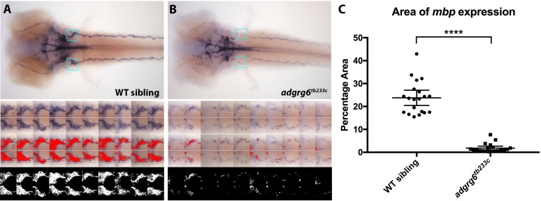 (A) Top, wild-type (WT) sibling: bright-field image of 4 dpf embryo stained with mbp. Dorsal view, anterior to the left. Blue box indicates the region of interest (ROI) used for the quantification of the left and right posterior lateral line ganglion region. Below, three sets of images of the left and right ROI for each of 10 embryos (total of 20 areas), including the bright-field images, the threshold area (red) levels set with HSB on Fiji (Hue: 166–236, Saturation: 43–98, Brightness: 31–184), and the binary image used to determine the area of staining. (B) adgrg6tb233c mutant embryo images comparable to those shown in A with identical threshold settings used in Fiji. (C) Comparison of the area of mbp staining between the adgrg6tb233c mutant and wild-type sibling embryos using the quantification obtained in A and B. ****p<0.0001, Student’s t-test. Error bars represent the mean ±95% CI.