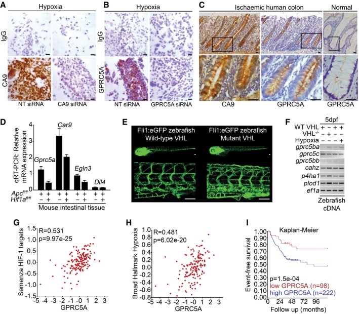 Expression of CA9 and GPRC5A in formalin‐fixed paraffin‐embedded hypoxic SW620 cells by IHC. Reduced CA9 and GPRC5A expressions with siRNA confirm antibody specificity (scale bars: 200 μm). IHC analysis of serial sections from human colorectal tissue from patients with mesenteric ischaemia (strangulated colon). GPRC5A is co‐expressed with CA9 in the colonic epithelial cells (scale bars: 50 μm). Quantitative RT–PCR analysis of mouse intestinal tissue. Gene expression was normalised to housekeeping gene Tg[ Bioinformatic analysis of transcriptomics dataset GSE24551. Gene set analyses reveal Kaplan–Meier curve following analysis of transcriptomics dataset GSE24551. Event‐free survival is significantly reduced in patients with tumours expressing high levels of