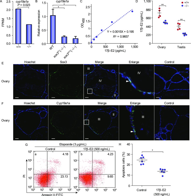 Disrupted pathway of 17β-E2 synthesis and up-regulated apoptosis in the sox3−/−ovaries. (A) The expression levels of cyp19a1a in both sox3+/+ and sox3−/− ovaries based on RNA-seq data. (B) Quantitative real-time PCR analysis of cyp19a1a expression levels in both sox3+/+ and sox3−/− ovaries. The transcript levels were related to β-actin expression. Relative level, 2−ΔΔCt. T-test was performed. *P < 0.05. (C) The standard curve of 17β-E2 concentration at OD450. (D) Down-regulated 17β-E2 in sox3−/− gonads in comparison with the wild type gonads. Data represented means ± SEM. T-test was performed. *P < 0.05; **P < 0.01. (E) Immunofluorescence analysis of Sox3 protein in adult ovary. Anti-Sox3 and FITC-conjugated goat anti-rabbit IgG (H + L) antibodies were used to detect Sox3 (green). The nuclei were stained by Hoechst (blue). Preimmune serum was used as a negative control. The white square area in the inset was enlarged and showed on the right. Sox3 positive signals were observed in somatic cells (theca cells and granulosa cells) (white arrowheads) in ovary. Scale bar, 50 μm. (F) Immunofluorescence analysis of Cyp19a1a protein in adult ovary. Anti-Cyp19a1a and FITC-conjugated goat anti-rabbit IgG (H + L) antibodies were used to detect Cyp19a1a (green). The nuclei were stained by Hoechst (blue). Preimmune serum was used as a negative control. The white square area in the inset was enlarged and showed on the right. Cyp19a1a positive signals were observed in somatic cells (theca cells and granulosa cells) (white arrowheads) in ovary. Scale bar, 50 μm. (G) Assessment of apoptosis using Annexin V-FITC/PI and flow cytometry. CHO cells were treated with 17β-E2 (500 ng/mL) or DMEM (control) for 36 h, and then treated with etoposide (3 μg/mL) for 12 h and assayed by flow cytometry. Viable cells exhibited Annexin V-/PI- (symbol 3 in the plot); early apoptotic cells exhibited Annexin V+/PI-(symbol 4 in the plot); late apoptotic cells exhibited Annexin V+/PI+ (symbol 1 in the plot); necrotic cells and some late apoptotic cells exhibited Annexin V-/PI+ (symbol 2 in the plot). (H) Percentages of both early and late apoptotic cells based on the apoptosis assessment by flow cytometry and Annexin V/PI in (G). T-test was performed. *P < 0.05