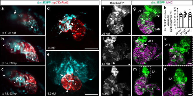 tbx1+ myocardial precursors connect to the FHF myocardium during heart tube stages. ac Maximum intensity projections of representative stages of a high-resolution reconstruction of the beating heart of a tbx1:EGFP;myl7:DsRed2 double-positive transgenic between 28 and 52 hpf; lateral view (right side) of the embryo, anterior to the top, ventricle to the upper left, atrium to the lower right, and cardiac imaging phase 27 (n = 1); ventricle (V), atrium (A), and bulbus arteriosus (BA). Arrows indicate tbx1+/myl7- cells at the OFT and IFT at the beginning of the time-lapse (a) that gradually turn on myl7 reporter expression (b, c). The dashed line (b, c) indicates the distal end of the ventricle and the arrowheads point to tbx1:EGFP-expressing cells at the OFT that never cross into the ventricle and are likely BA precursors. d, e Maximum intensity projections of SPIM-imaged tbx1:EGFP;myl7:DsRed2 double-positive transgenic hearts stopped from contracting with BDM at 54 hpf (n = 3) or 3.5 dpf (n = 7), respectively; ventral views, anterior to the top. tbx1 reporter expression can be detected in differentiated tbx1/myl7 reporter double-positive cardiomyocytes (arrows d, e), the tbx1+/myl7- OFT at 54 hpf (arrowhead d), and the tbx1+/myl7- BA at 3.5 dpf (asterisk e). f, g, in Top-down 2-µm confocal section of isolated zebrafish hearts at 26 (f, g), 54 (ik), and 72 hpf (ln) from tbx1:EGFP, counterstained with anti-GFP and anti-MHC; OFT/BA to the top, sinoatrial node (SAN) or atrium (A) to the bottom left, and ventricle (V) to the top left. k, n A magnification of the framed area in j, m. f, gtbx1:EGFP is expressed at the MHC-negative arterial pole (AP) of the heart tube (arrowhead). h Quantification of the tbx1:EGFP-positive ventricular cardiomyocytes compared to whole ventricle (in percentage) reveals no change over developmental period from 26 hpf (n = 5), 54 hpf (n = 11), to 72 hpf (n = 15). Each data point represents averaged percentage per heart; means ± s.d. ik At 54 hpf, cardiomyocytes of the later-differentiated distal ventricle express tbx1:EGFP (arrowhead), as do MHC-negative progenitors of the OFT (asterisks). ln The differentiated BA at 3 dpf is positive for tbx1:EGFP. Scale bars 200 µm (d, e), 10 µm (f, g, in)