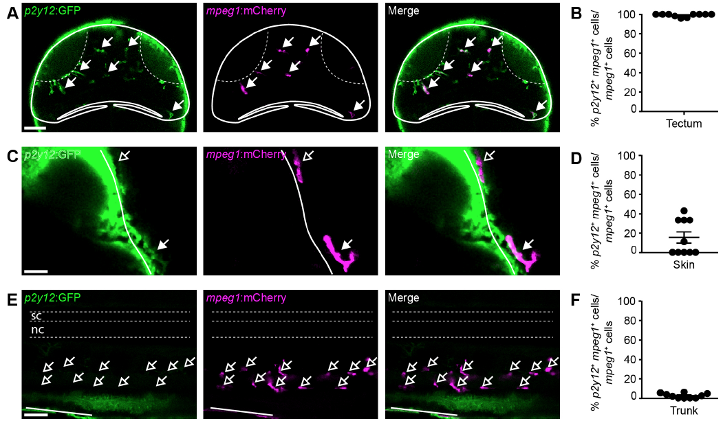 P2Y12 is expressed in virtually all mpeg1+ tectal cells and some mpeg1+ skin cells, but not in mpeg1+ cells in the trunk. (A,C,E) Confocal images of the optic tectum (A), skin (C), and trunk (E) of a p2y12:GFP;mpeg1:mCherry animal. Filled or empty arrows indicate colocalisation, or lack thereof, between p2y12 and mpeg1. Scale bars, 50 μm (A,E) and 20 μm (C). (B,D,F) Quantification of the proportion of p2y12+/mpeg1+ cells among all mpeg1+ cells in the tectum (B), skin (D) and trunk (F). n = 10 animals per experimental group